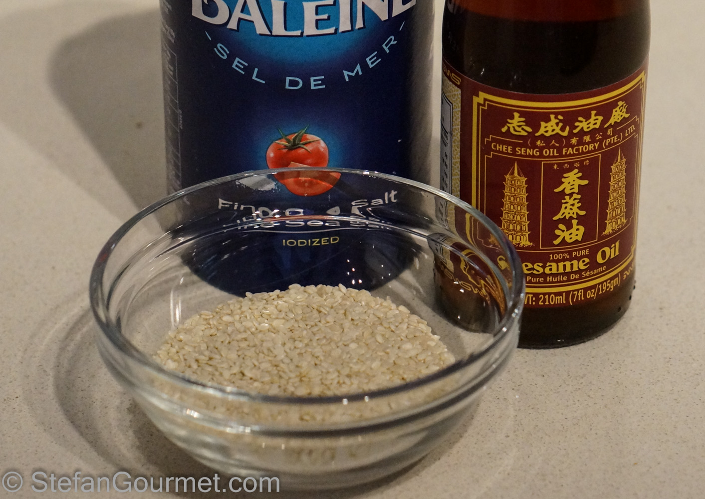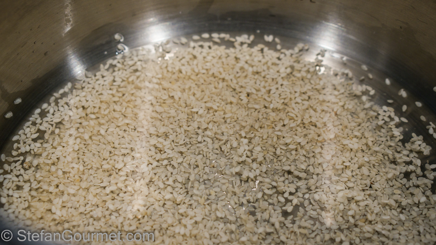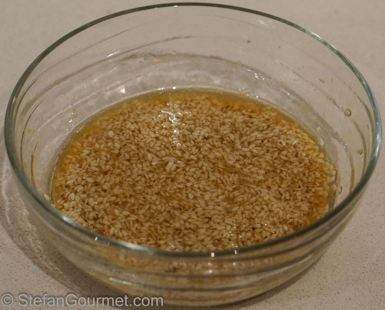 Ingredients: 50 grams sesame seeds, 250 grams water, 40 grams toasted sesame oil, and salt to taste. This makes a bit more than what is needed for the shrimp cocktail.