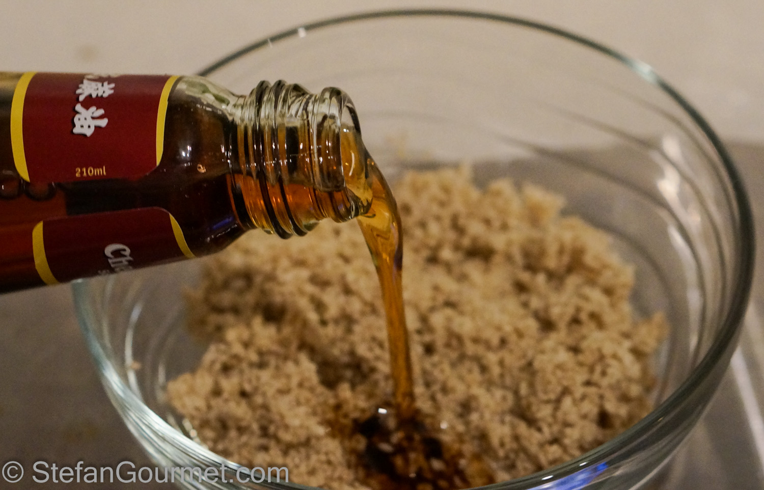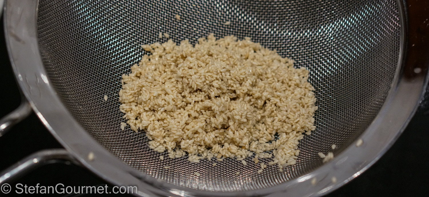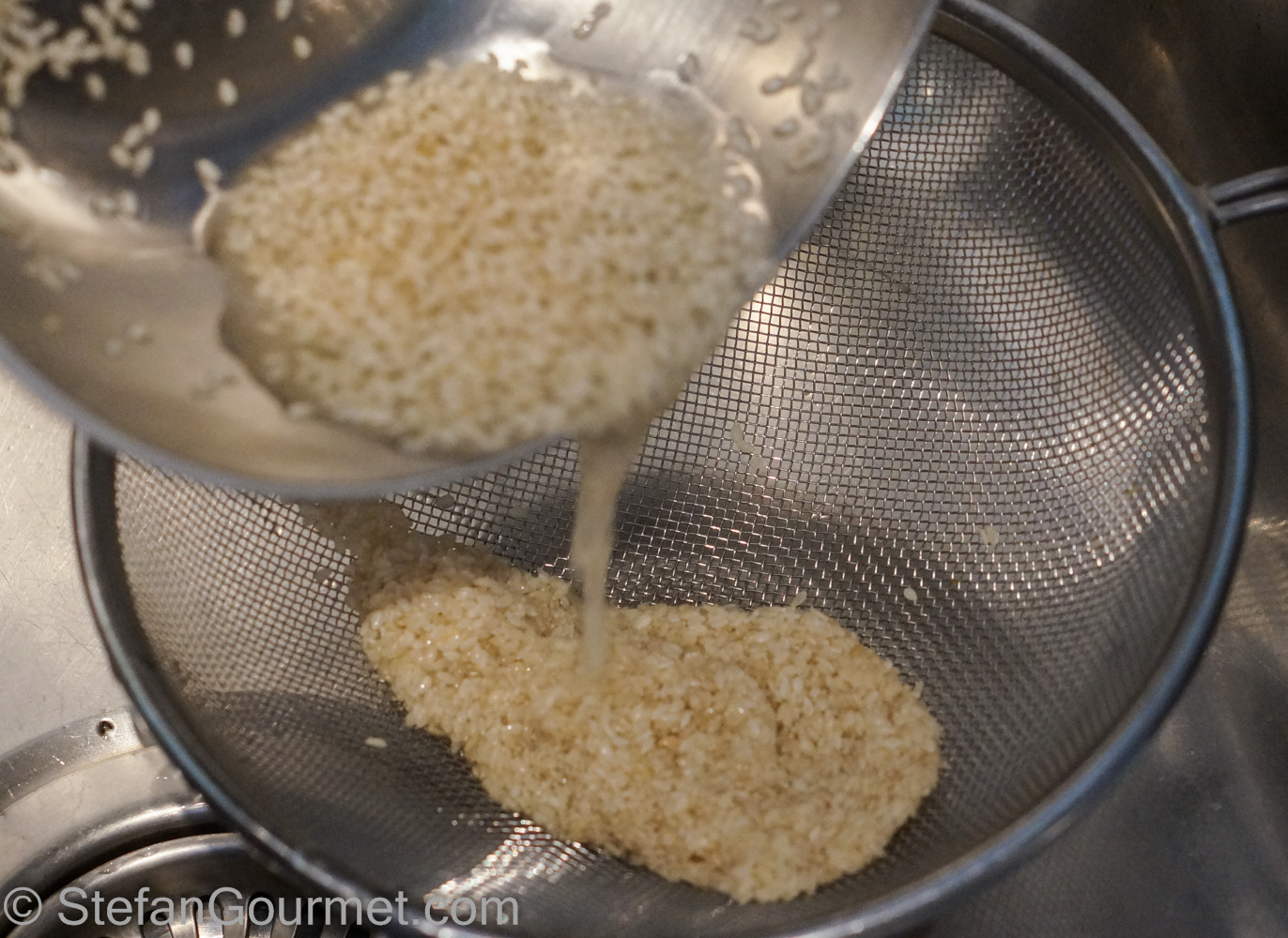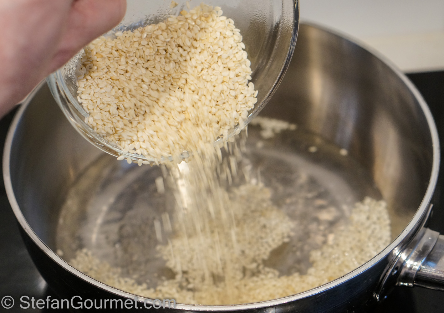 Ingredients: 50 grams sesame seeds, 250 grams water, 40 grams toasted sesame oil, and salt to taste. This makes a bit more than what is needed for the shrimp cocktail.