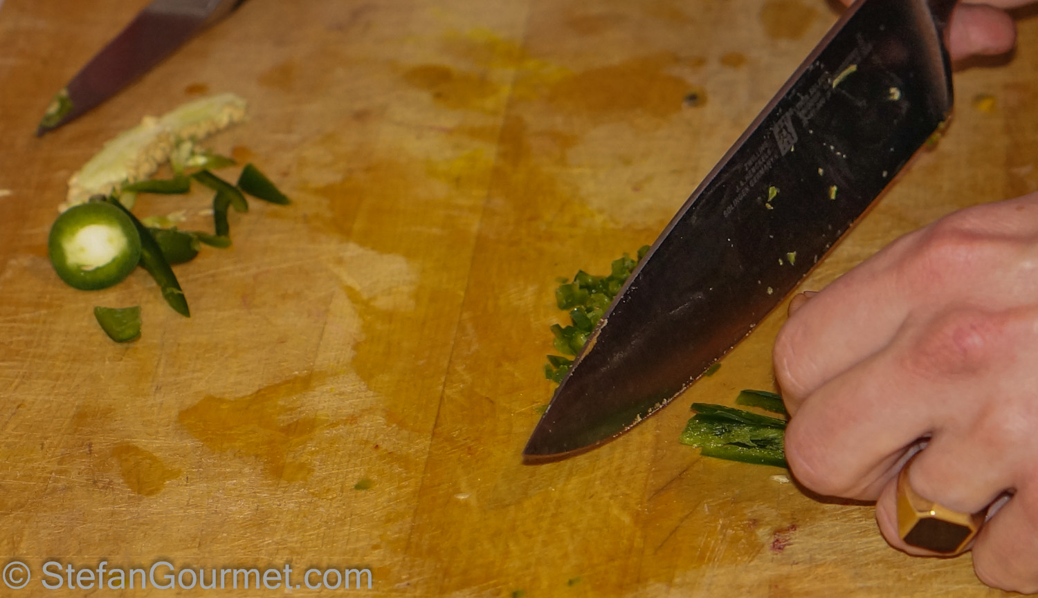 The vinaigrette requires 3 grams of jalapeño brunoise. Brunoise is French for small dice. 3 grams is just a small part of a jalapeño.