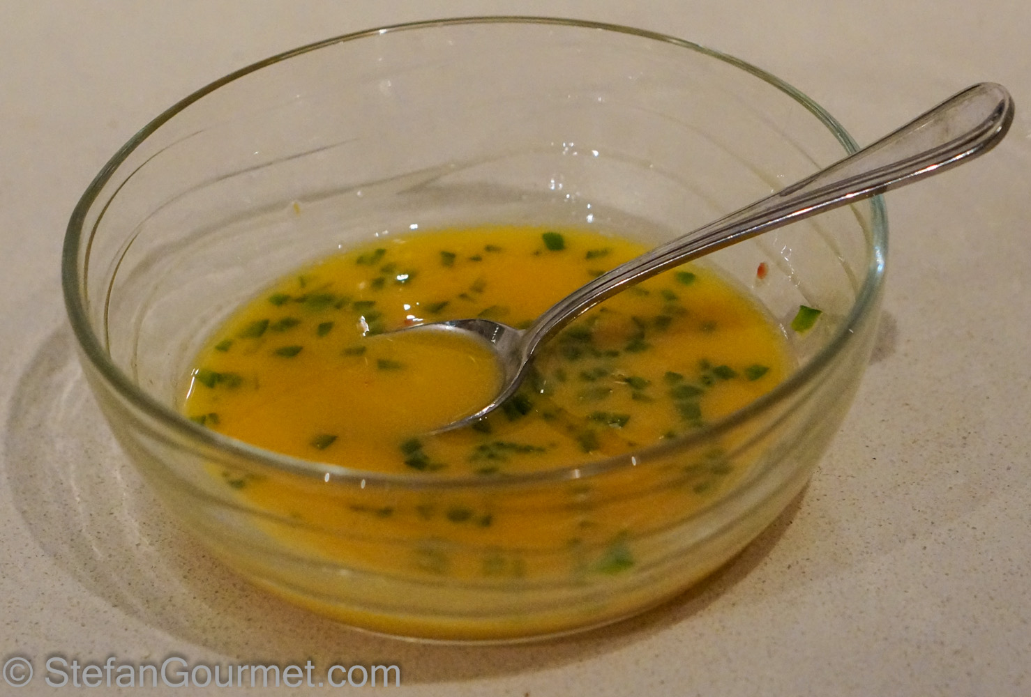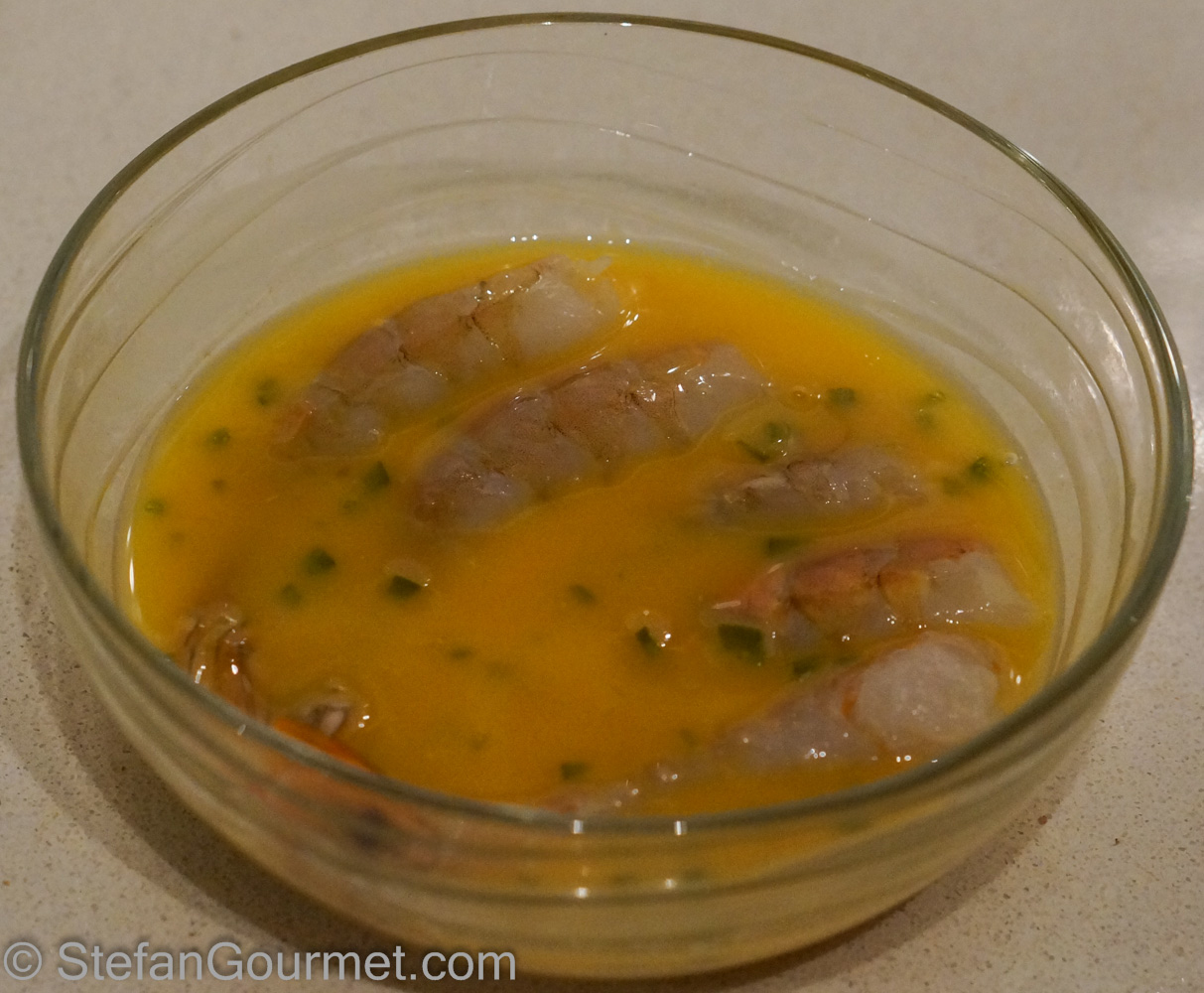 Marinate the shrimp in the passion fruit vinaigrette for 3 minutes. (Not longer, as you are not making ceviche.)