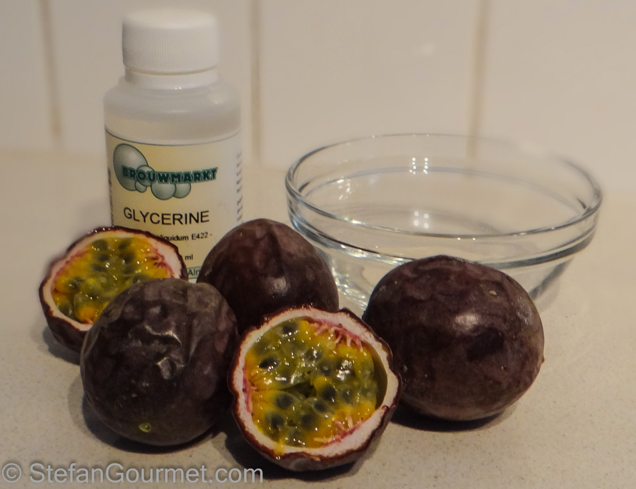 To the passion fruit puree (I made 150 grams), add 0.8% agar and 2.5% glycerol, and stir to mix.
