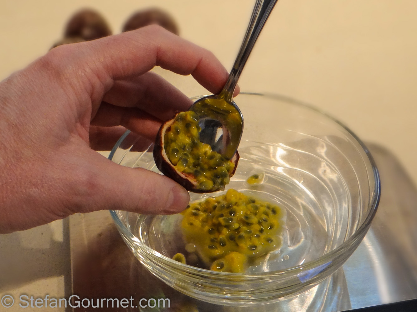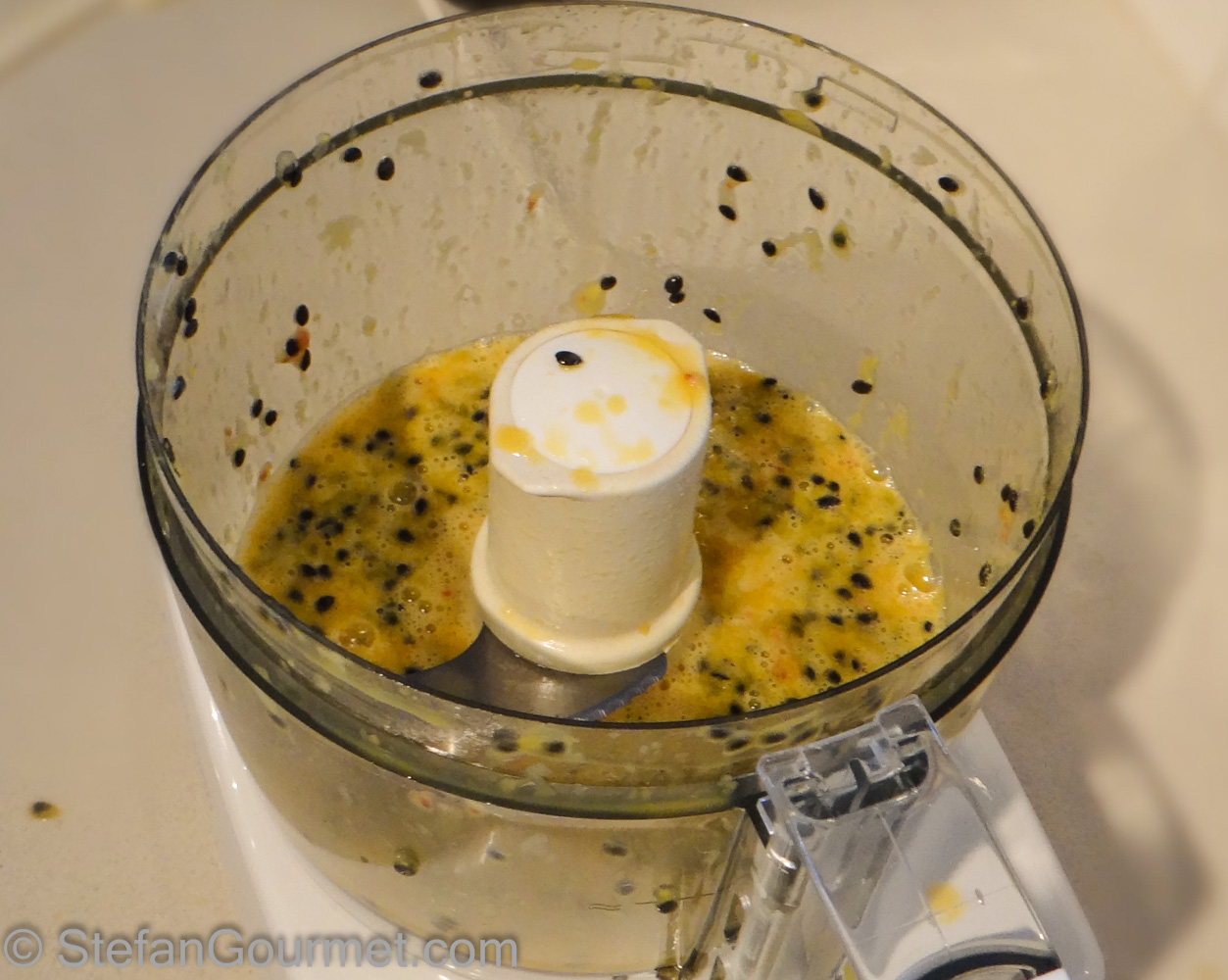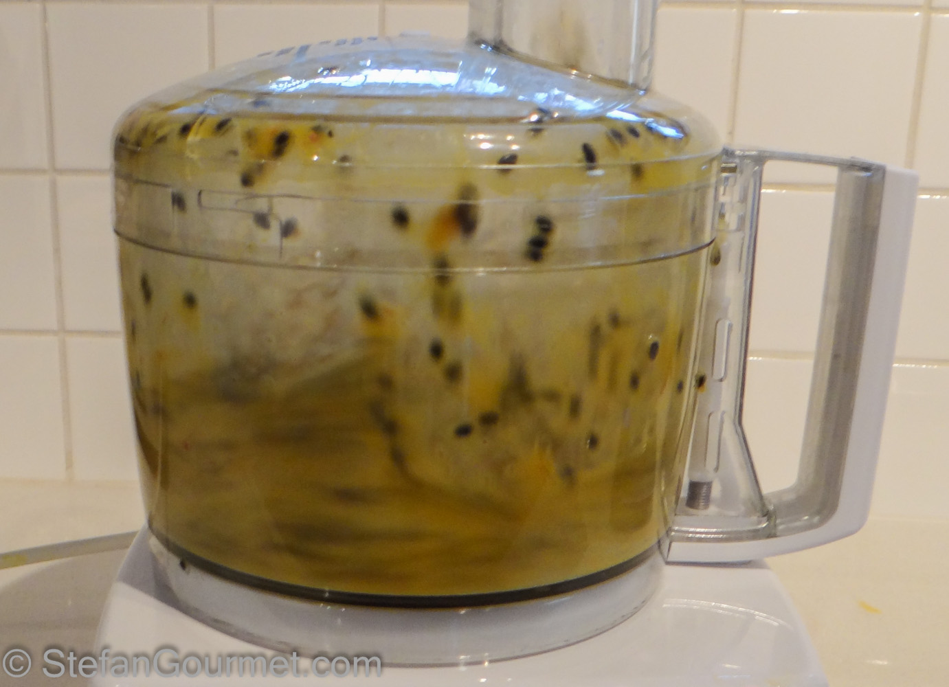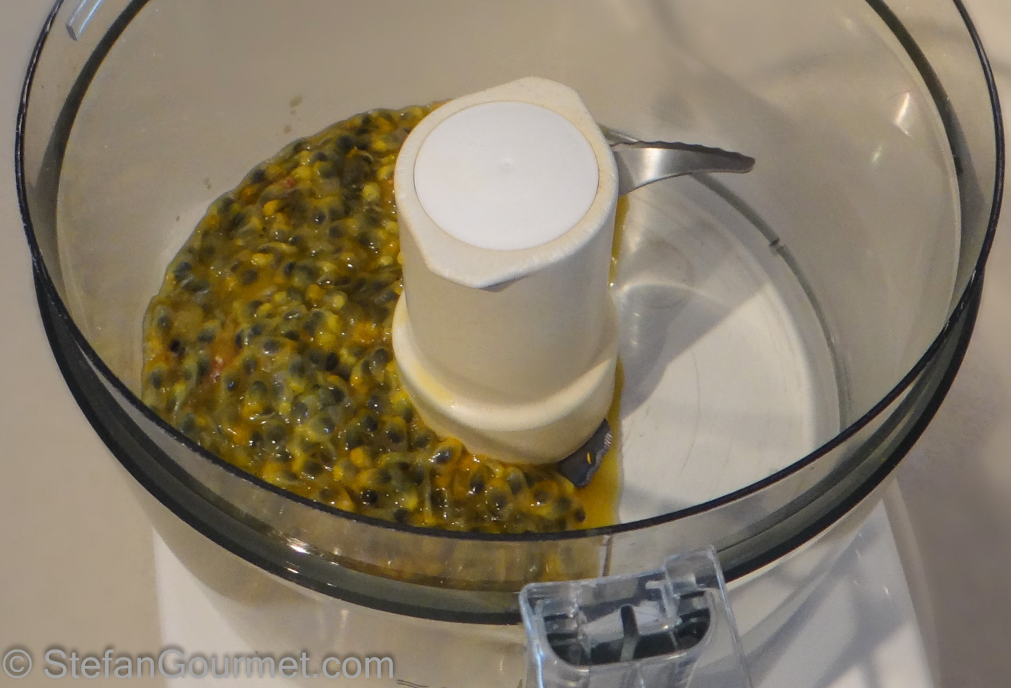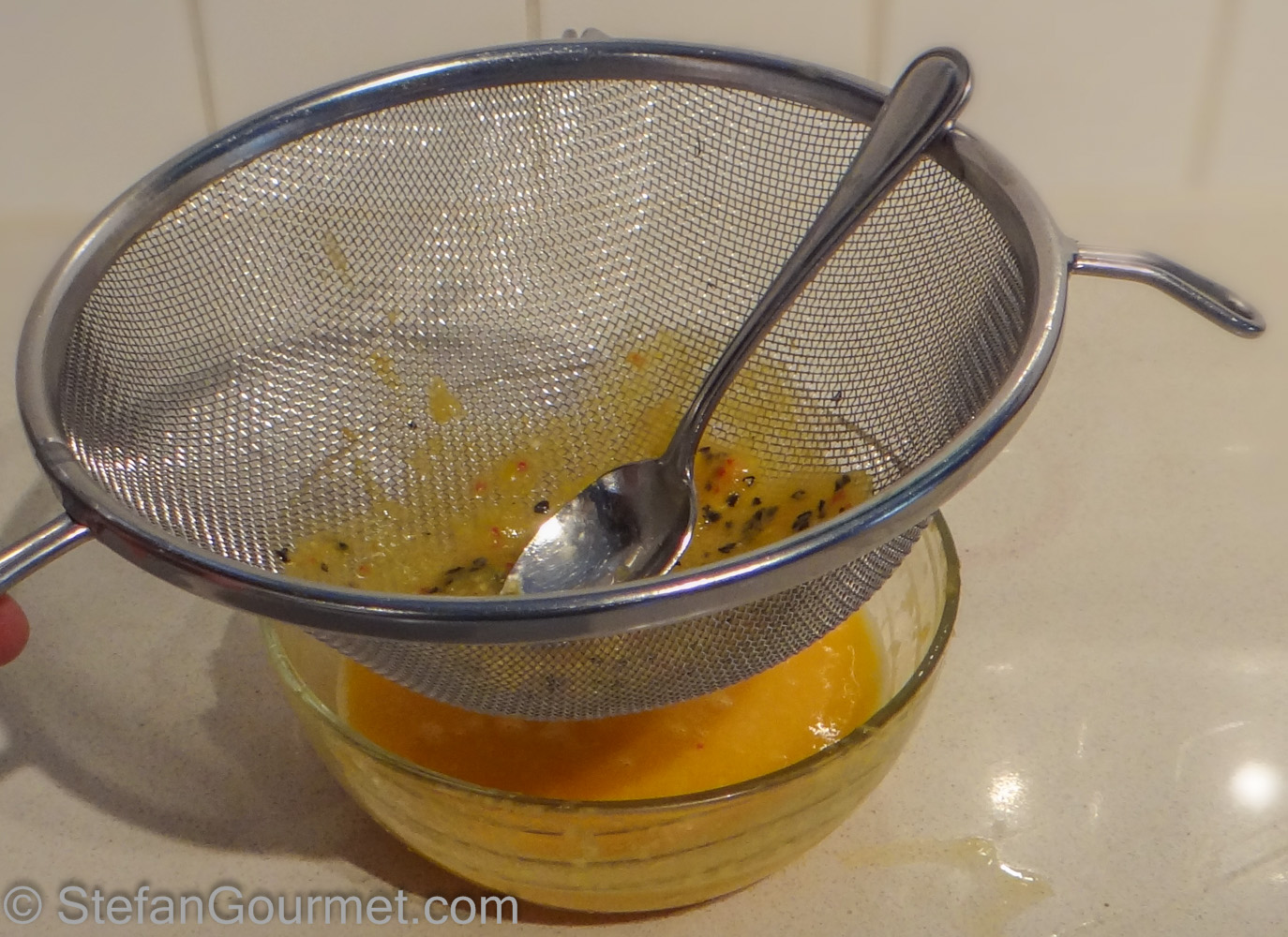 Pass through a sieve to obtain the passion fruit puree. (The book distinguishes between passion fruit juice and passion fruit puree. To me they are the same.)