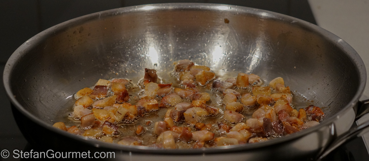 Meanwhile, sauté the diced guanciale or pancetta in a frying pan over medium heat without any added fat.