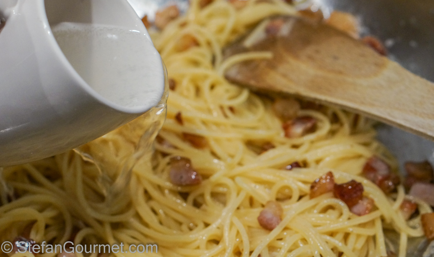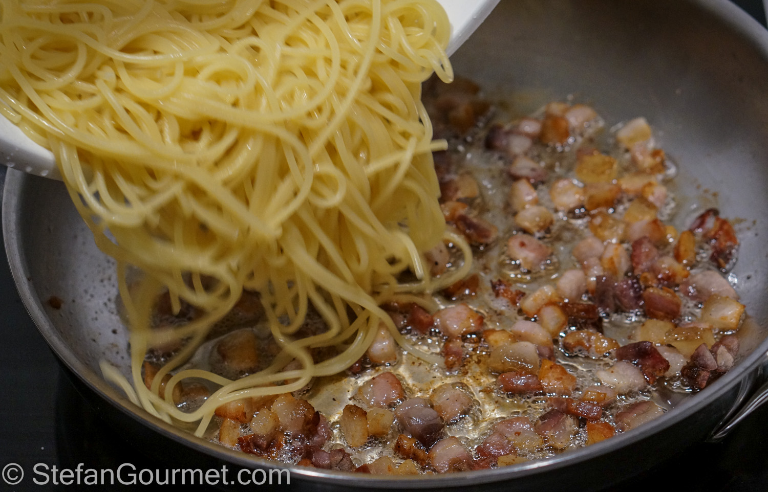 When the spaghetti is al dente, drain but reserve some of the cooking water. Add the spaghetti to the guanciale or pancetta.