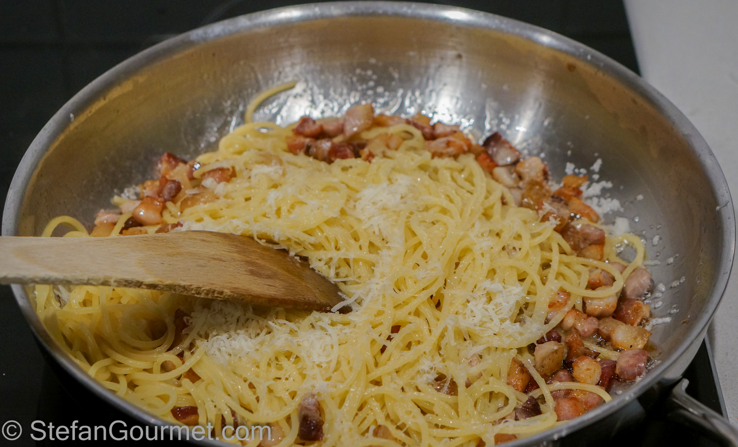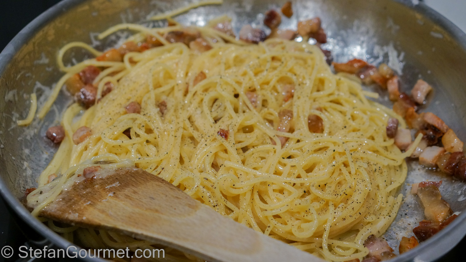 …and season liberally with freshly ground black pepper. Toss to mix. The pork fat with the cooking water and the cheese will mix to become a very nice sauce.