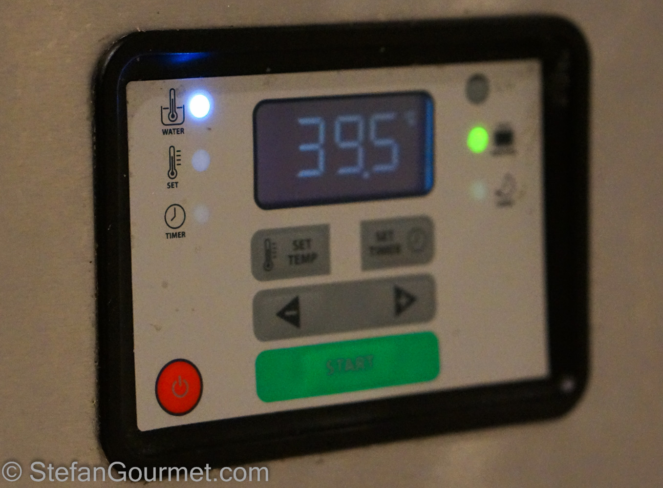 Cook sous-vide for 1 hour at 39.5ºC/103ºF. Then raise the temperature to 49.5ºC/121ºF and cook for another hour.
