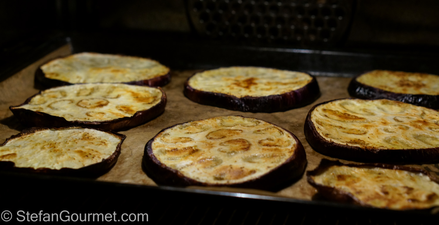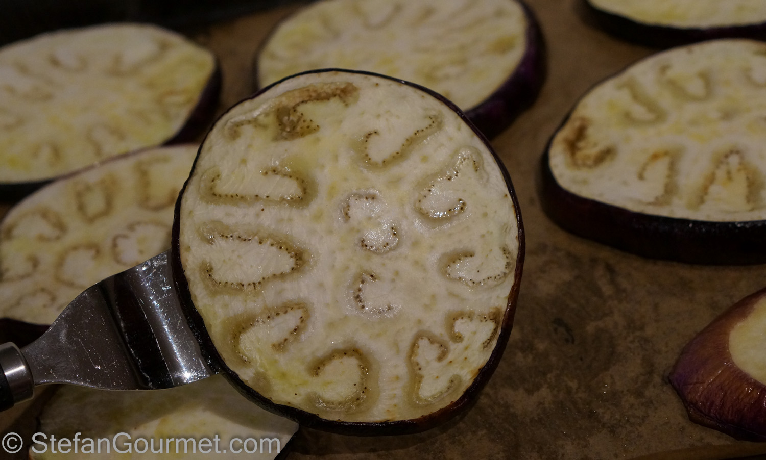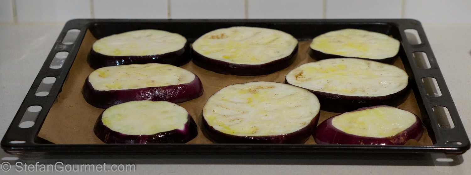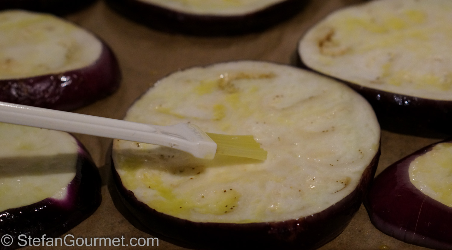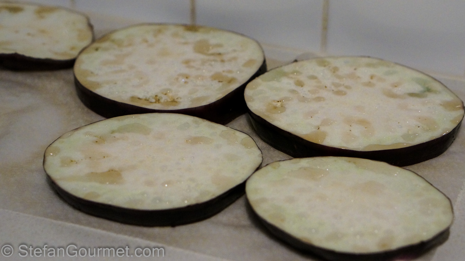 Preheat the oven to 225ºC/440ºF. Wipe off the salty juices with paper towels. Brush the eggplant slices with olive oil on all sides.