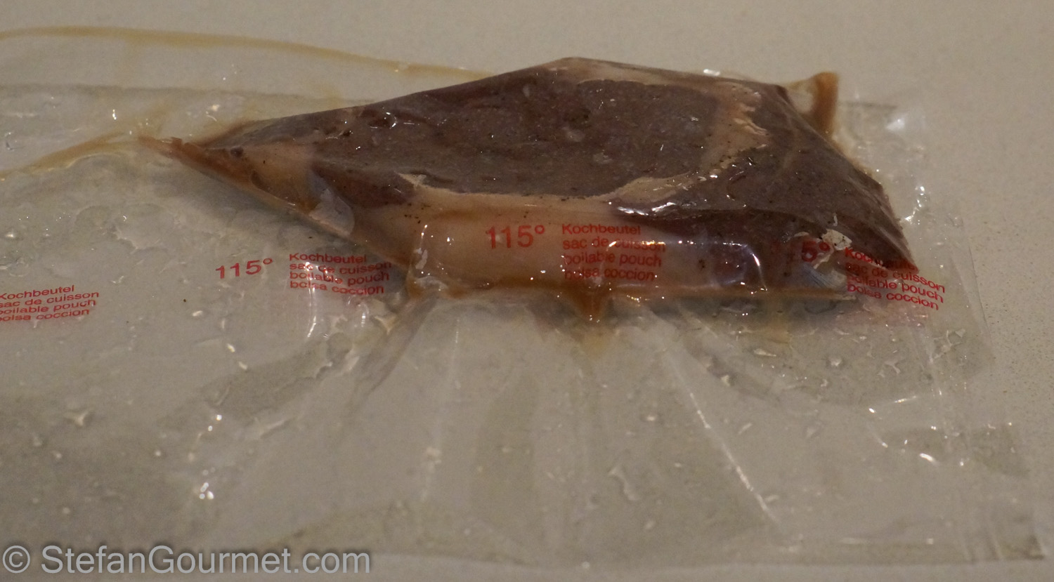 The bison ribeye will only have lost a minimal amount of juices during the warm aging in the sous-vide cooker.