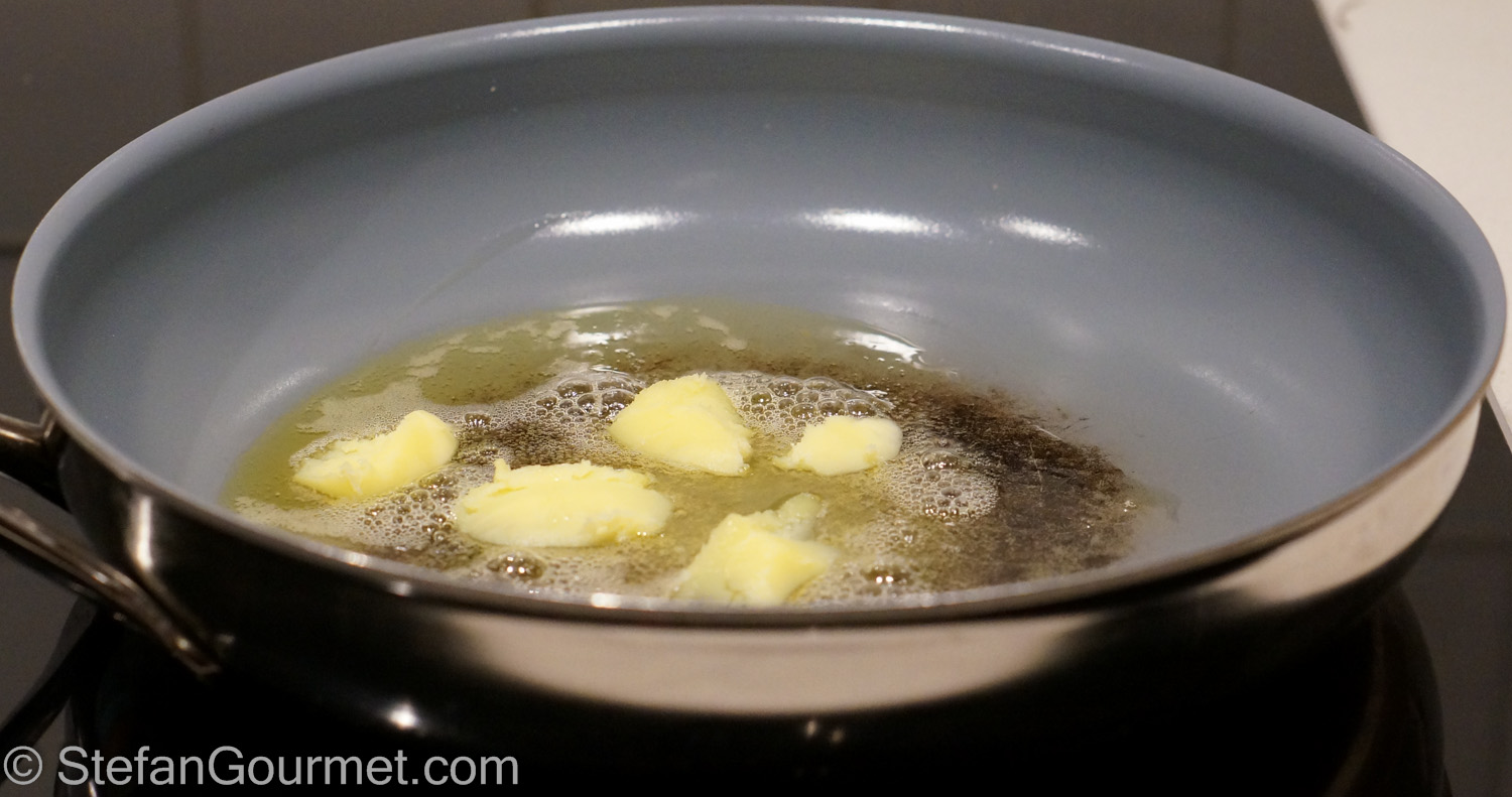 Melt some clarified butter in a frying pan and make sure the pan is very hot. Clarified butter doesn’t burn like regular butter, and it provides better browning than oil. As an alternative you could also use rendered bison fat or beef fat.