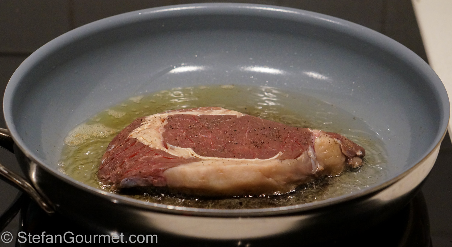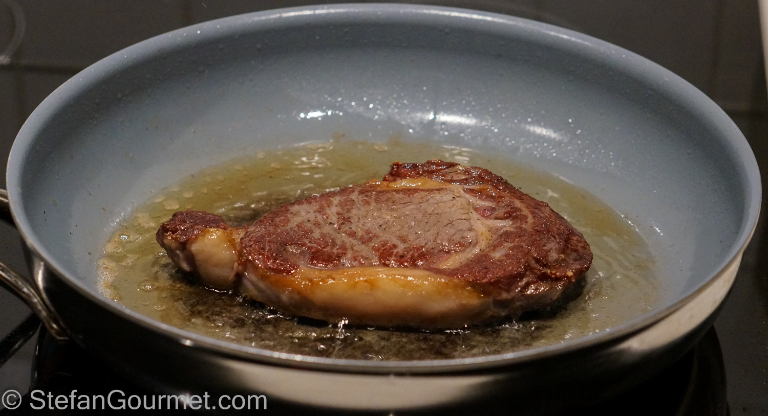 As soon as the steak is nicely browned, after two minutes or so, turn it over to brown the other side as well for a minute or two.