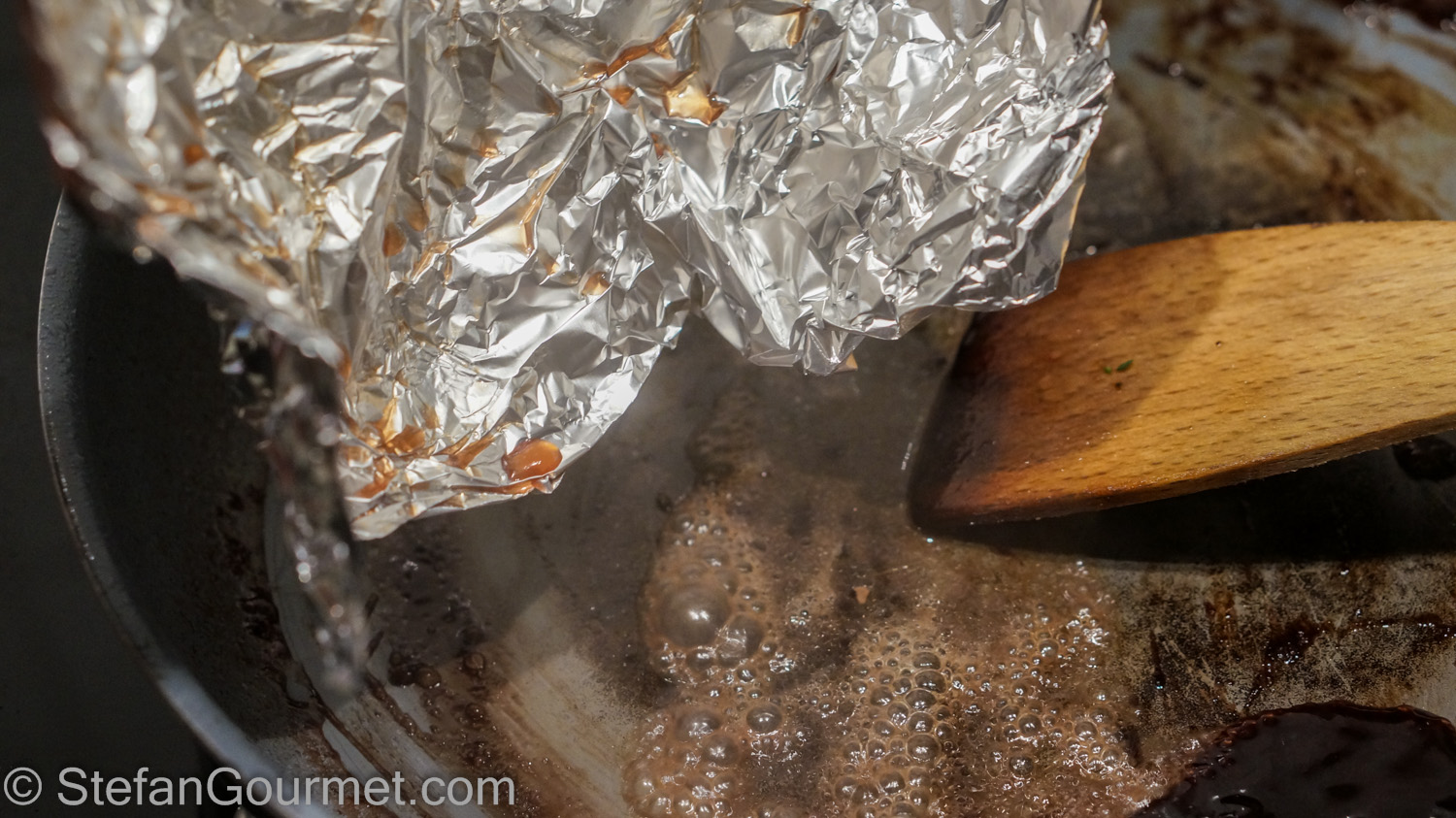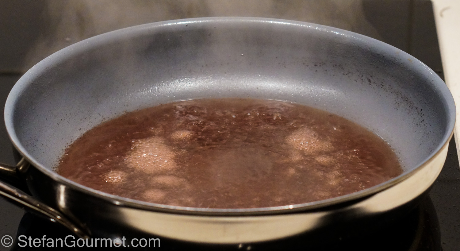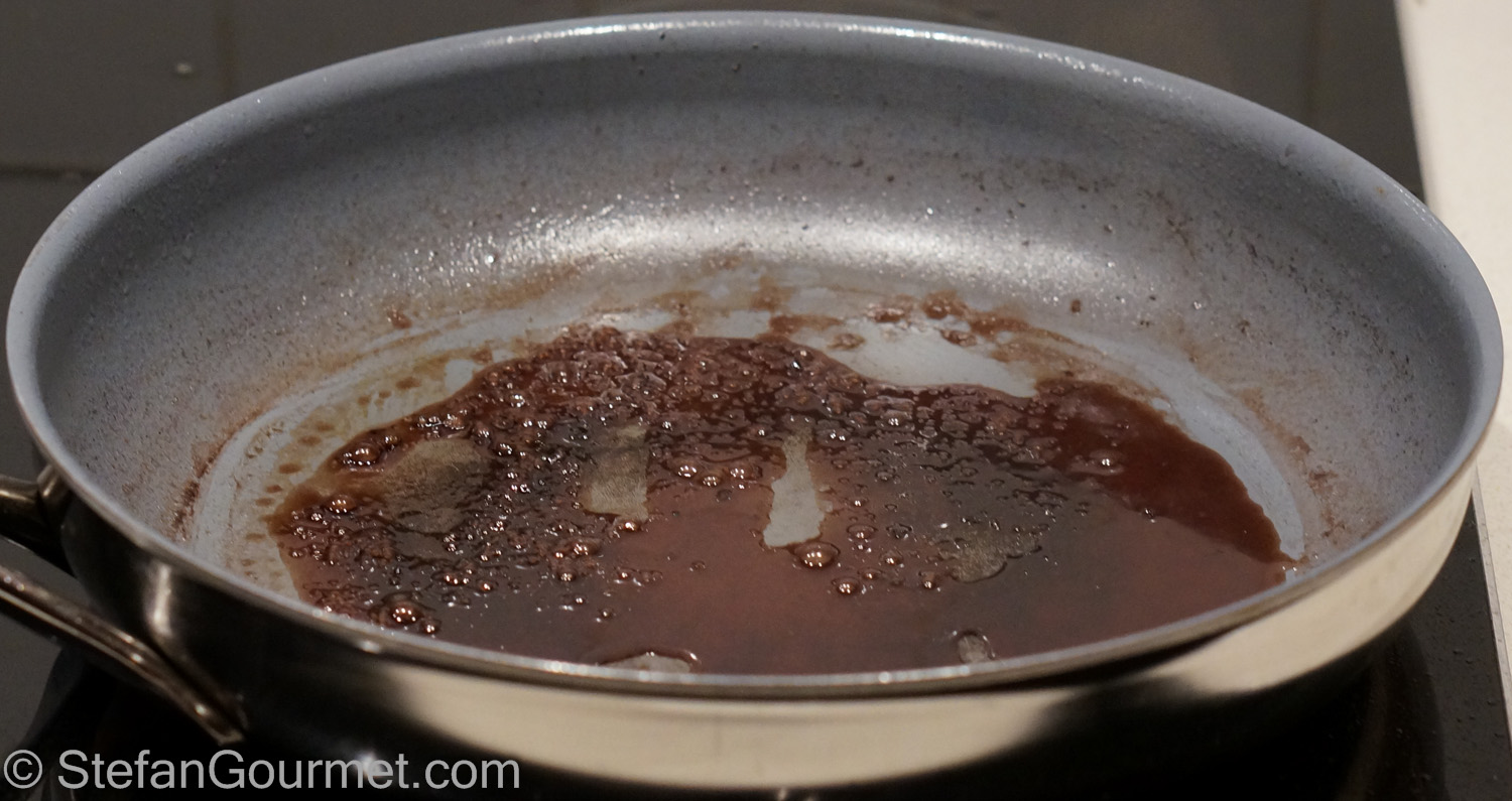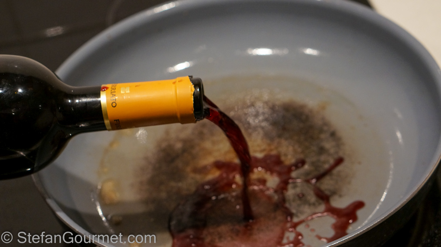 Meanwhile, deglaze the pan with some red wine. It is always a good idea to use the wine you will be drinking with the dish.