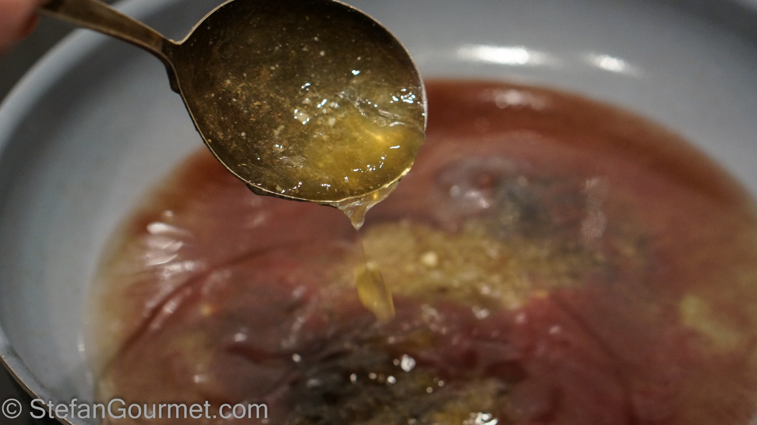‘Warm aging‘ is a term that I made up for meat that has been aged at the optimal temperatures for the enzymes that do the aging. The usual types of aging are cryovac or wet aging (vacuum sealed at refrigerator temperatures) or dry aging (at refrigerator temperatures). Both will tenderize the meat, dry aging will also add flavor if done long enough. At refrigerator temperatures the enzymes responsible for the tenderizing work very slowly, which is why aging at such temperatures takes weeks. Just below 40ºC/104ºF and 50ºC/122ºF, the calpain and cathepsin enzymes will work much faster. The meat can only be held at such temperatures for a couple of hours. You can think of it as bringing the meat to room temperature in a very warm room 😉 After that, a quick sear in very hot clarified butter will make the steak perfectly medium rare from edge to edge, very tender, and very juicy. As you can see in the picture, the meat is medium rare right to the very edge.