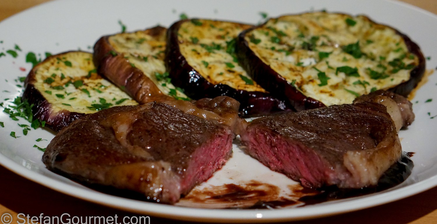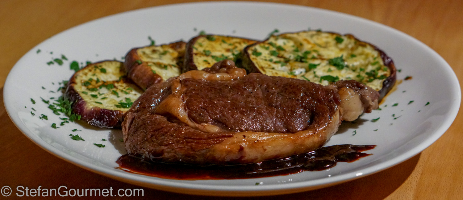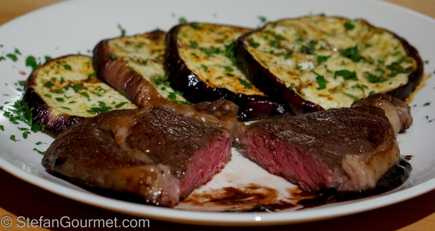 Bison rib eye is the best! Of course, I love eggplant. 🙂 Looks great, Stefan.