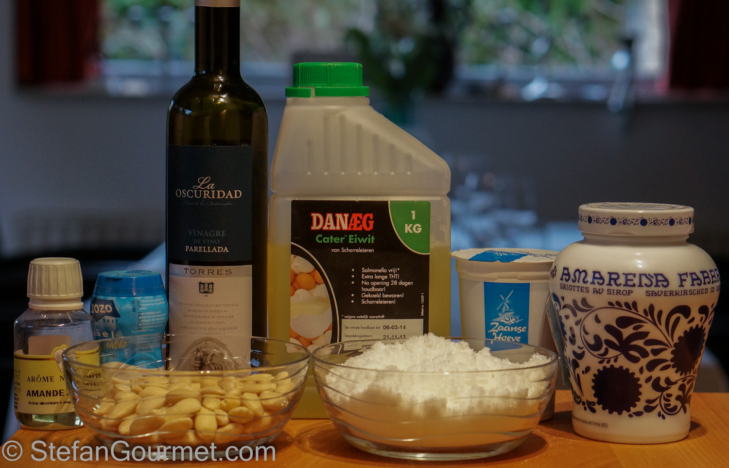 When we visited Conor and ‘the Wife’ in Tipperary, she made us a wonderful meringue cake with raspberries using her mother’s recipe. It was lovely and we loved it. I decided then and there that I would bake one too, using Italian amarena cherries instead of raspberries as they are great with almonds. Amarena cherries are dark sour cherries from the region of Emilia Romagna, sold in jars with syrup. They are very aromatic and have great depth of flavor.