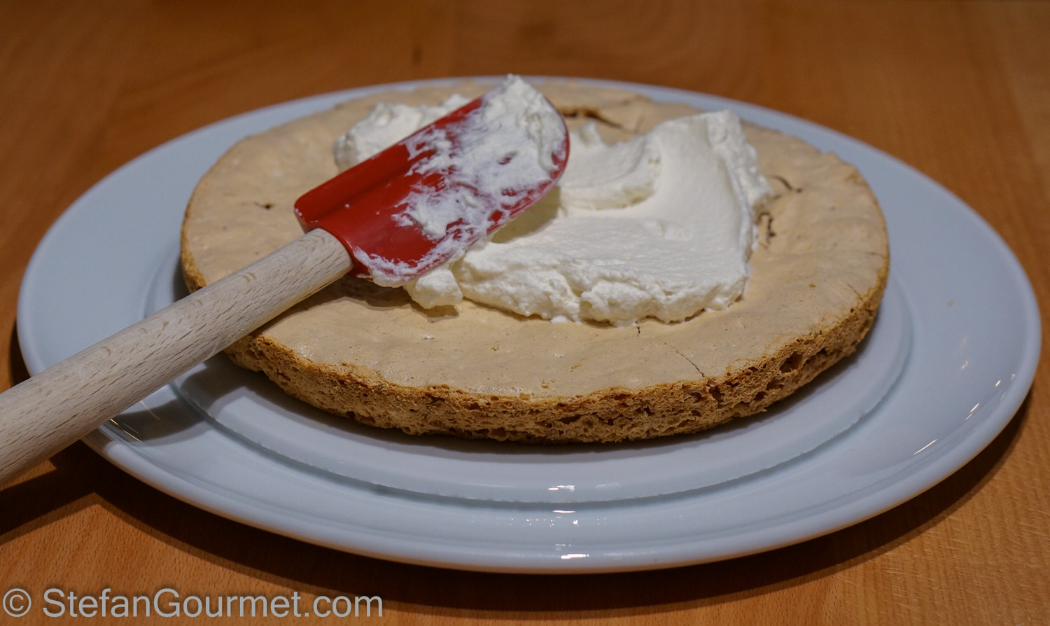 5. Marvelous Stefan! Using the springform cake pans make them evenly round, smoother and thicker layers. Piping it, I had two (rather 4) less items to wash and snacked on some trimmings while assembling the cake . 😀 ))) I use sour cherry-preserves in many of my desserts. I just got an idea of using them for future the dacquoises I make! 😛