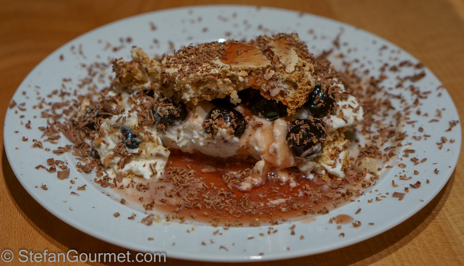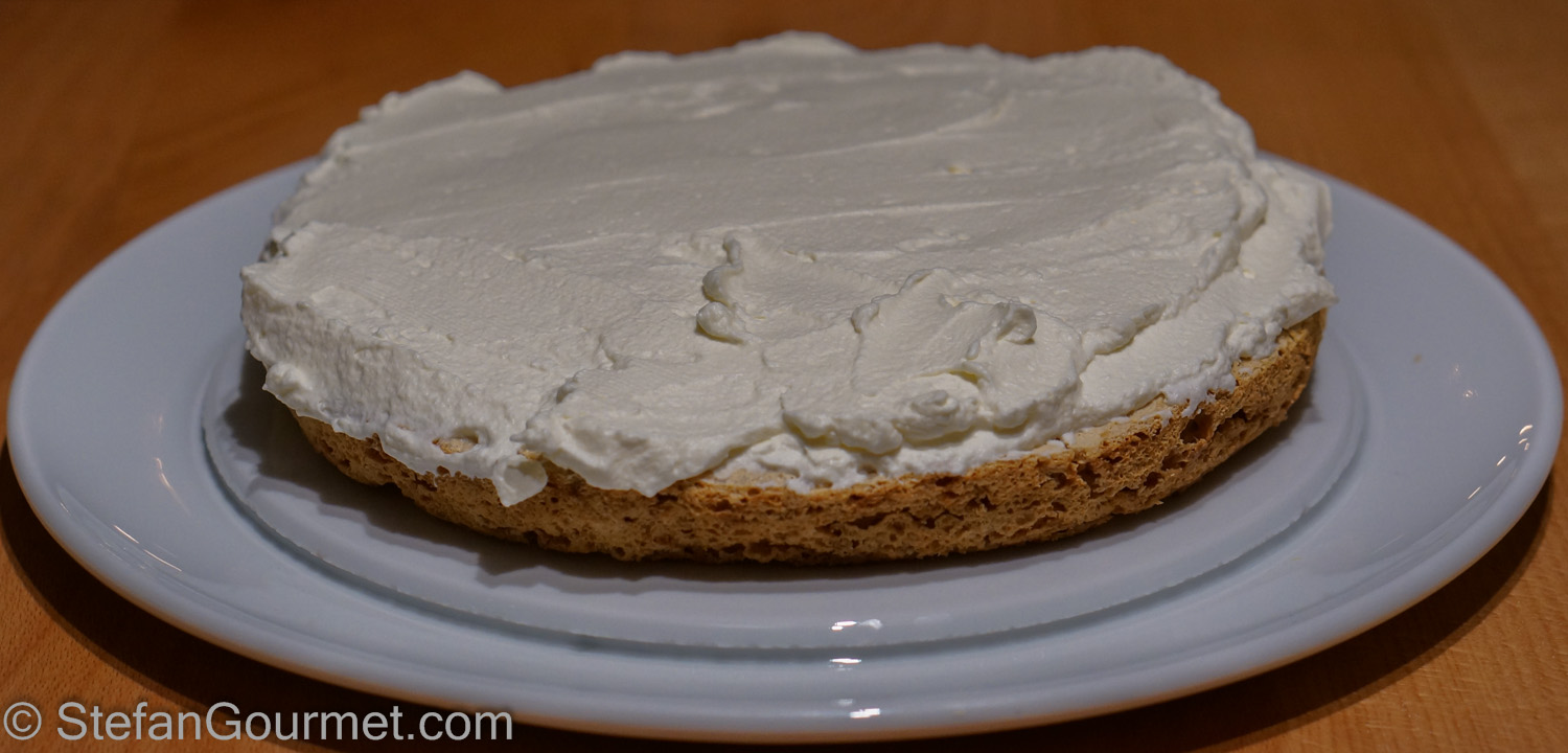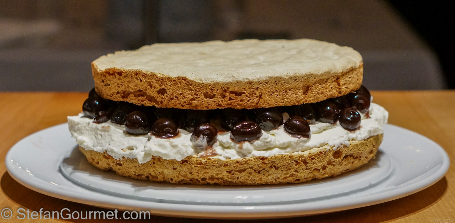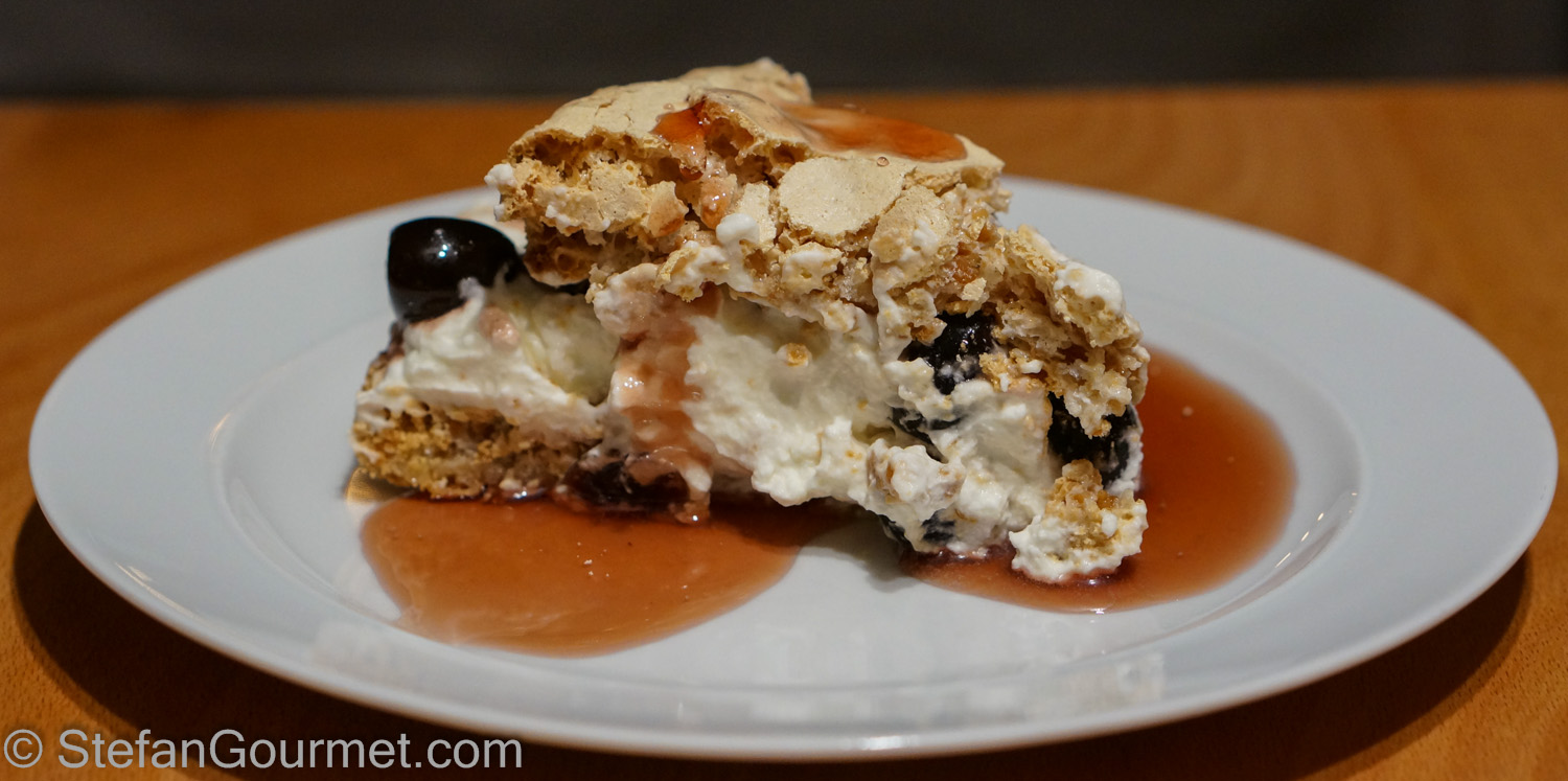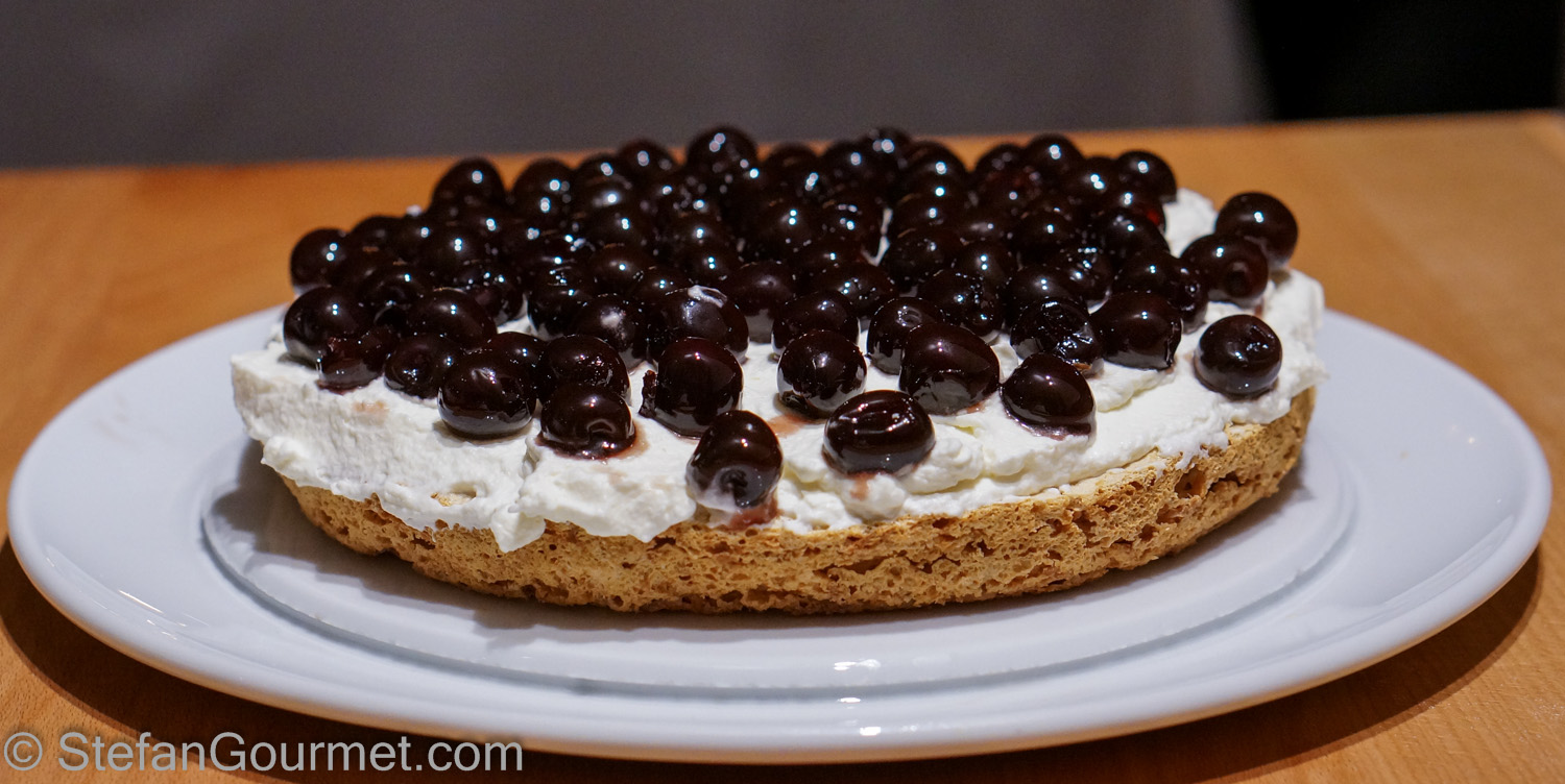 In honor of Noreen’s recipe I’m also calling this a meringue cake, but it is also known as pavlova. This type of cake was invented in Australia or New Zealand in the 1920s to honor the tour of a Pavlova the Russian ballet dancer. A pavlova consists of meringue that is crispy on the outside but soft on the inside, whipped cream, and fruit. As I had expected, the combination with beautiful Italian amerena cherries was simply divine.