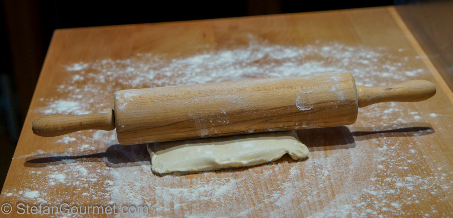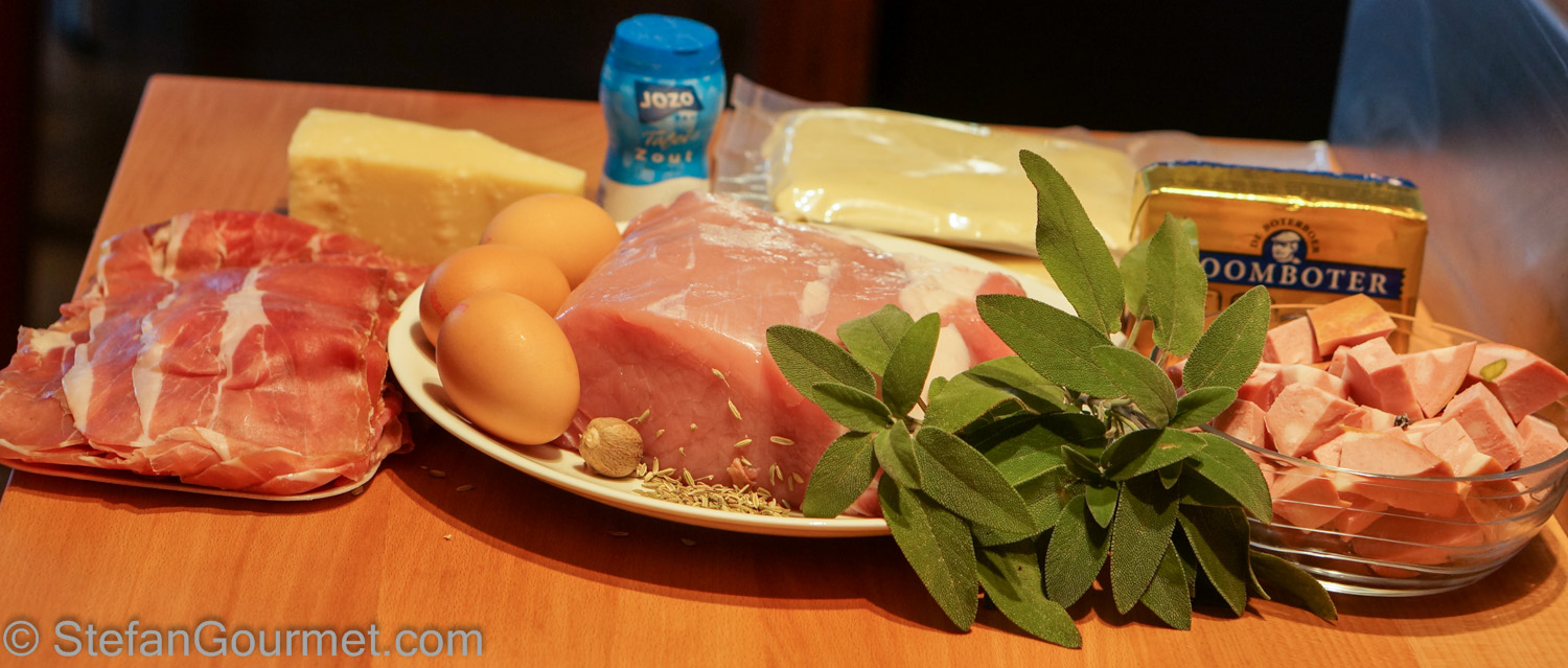 Saucijzenbroodjes (sausage rolls) are a very popular snack in the Netherlands. They consist of spicy sausage meat encased in puff pastry and are usually served warm. I don’t like regular saucijzenbroodjes very much. I think it is something about the spice mix. Some years ago I decided to create my own sausage rolls to serve as a snack at my birthday party, using Italian tortellini stuffing as the basis for them. Homemade puff pastry with a stuffing of pork loin, prosciutto, mortadella, nutmeg, fennel seeds, fresh sage, and parmigiano, what’s not to like? I loved them indeed, and so did my friends. And so I made them again.