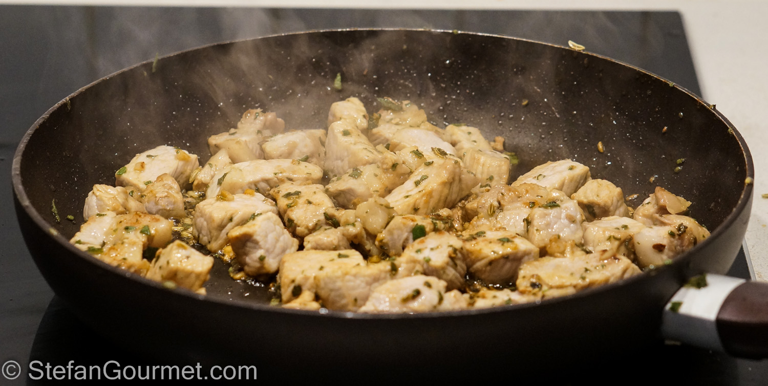 Melt the butter in a frying pan and brown the pork loin in batches with the fennel seeds, sage, and garlic. Make sure the garlic doesn’t burn. The meat doesn’t need to be cooked through (it is better if you don’t), just browned.