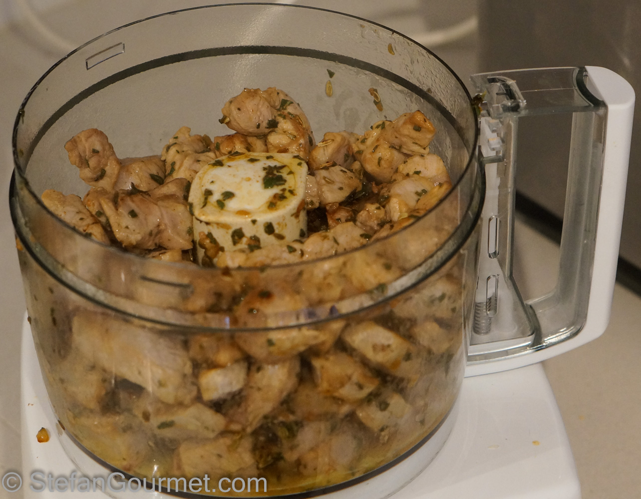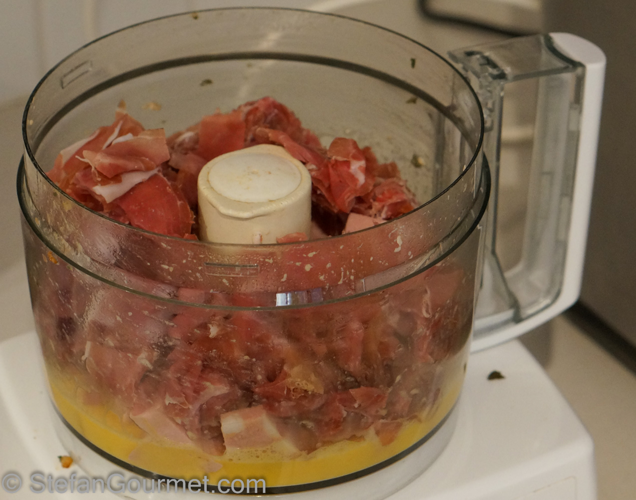 Process until the mixture is homogeneous. Combine the ground pork loin with the prosciutto mixture and mix until homogeneous.