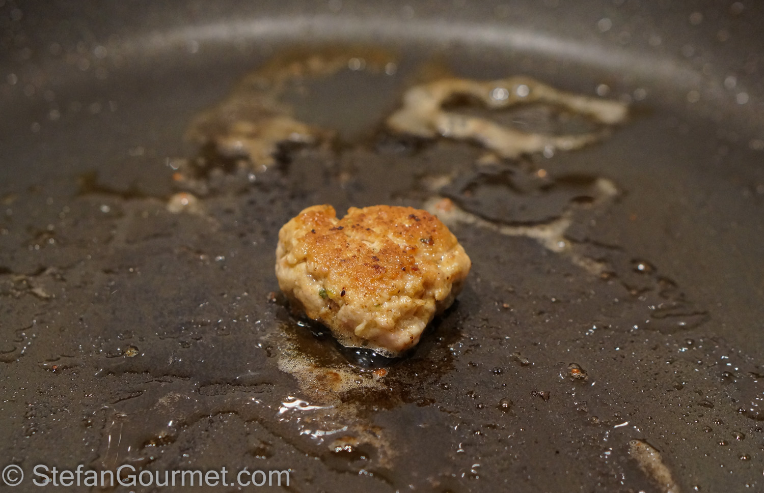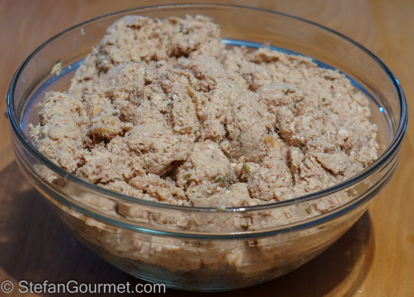 Take a small piece of the mixture and fry it in a bit of butter until it’s just cooked through. Taste it. If needed, add salt or more nutmeg or something else to your liking. Frying the stuffing is needed before tasting it, as it may contain undercooked pork as well as raw egg.