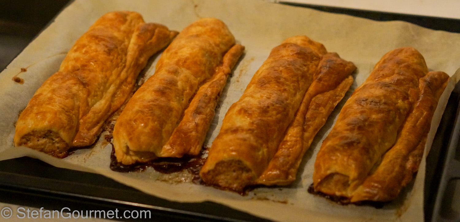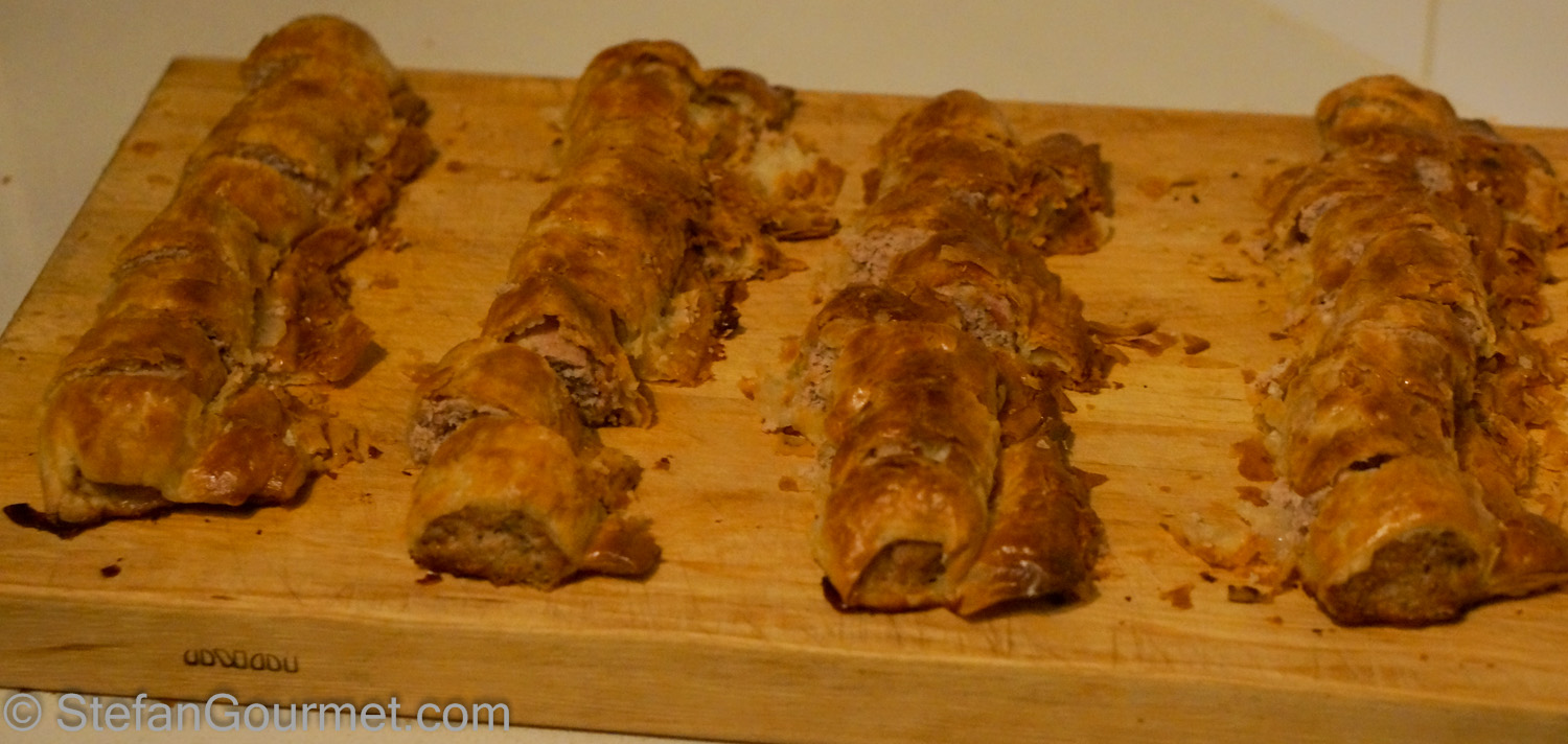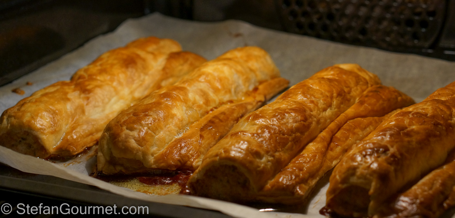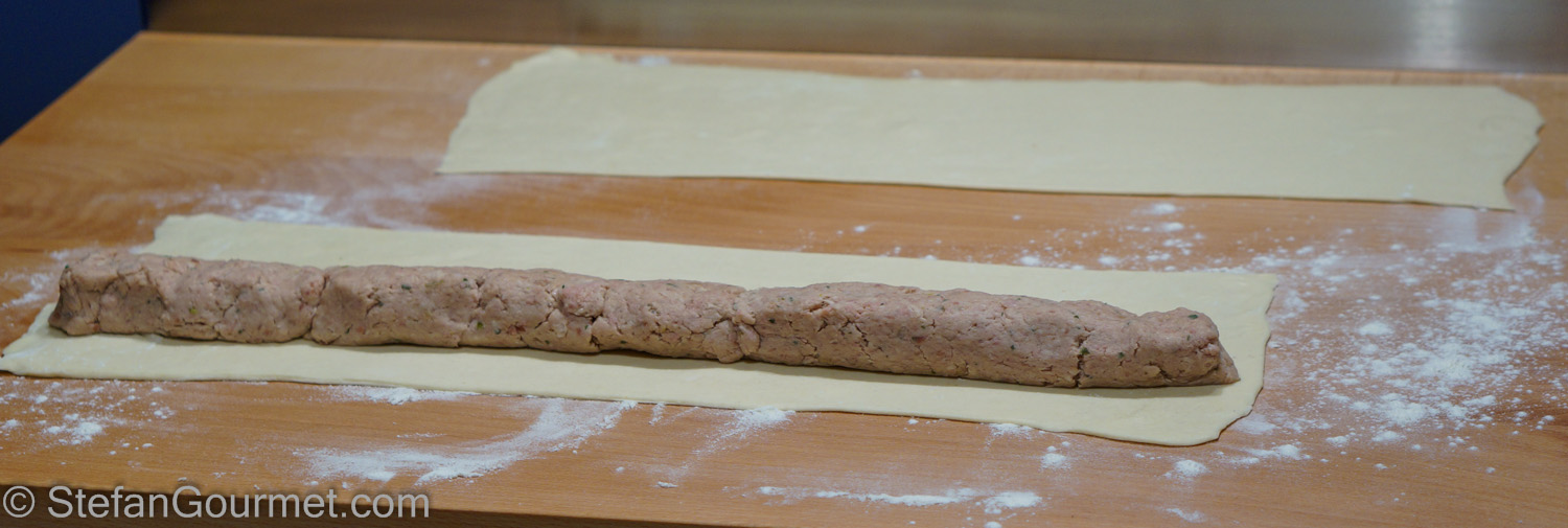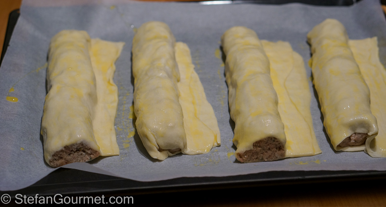 Divide the meat mixture into 8 equal portions. Roll out each portion into a cylinder of 30 cm (12 inches) long. Put each cylinder on  a piece of puff pastry…