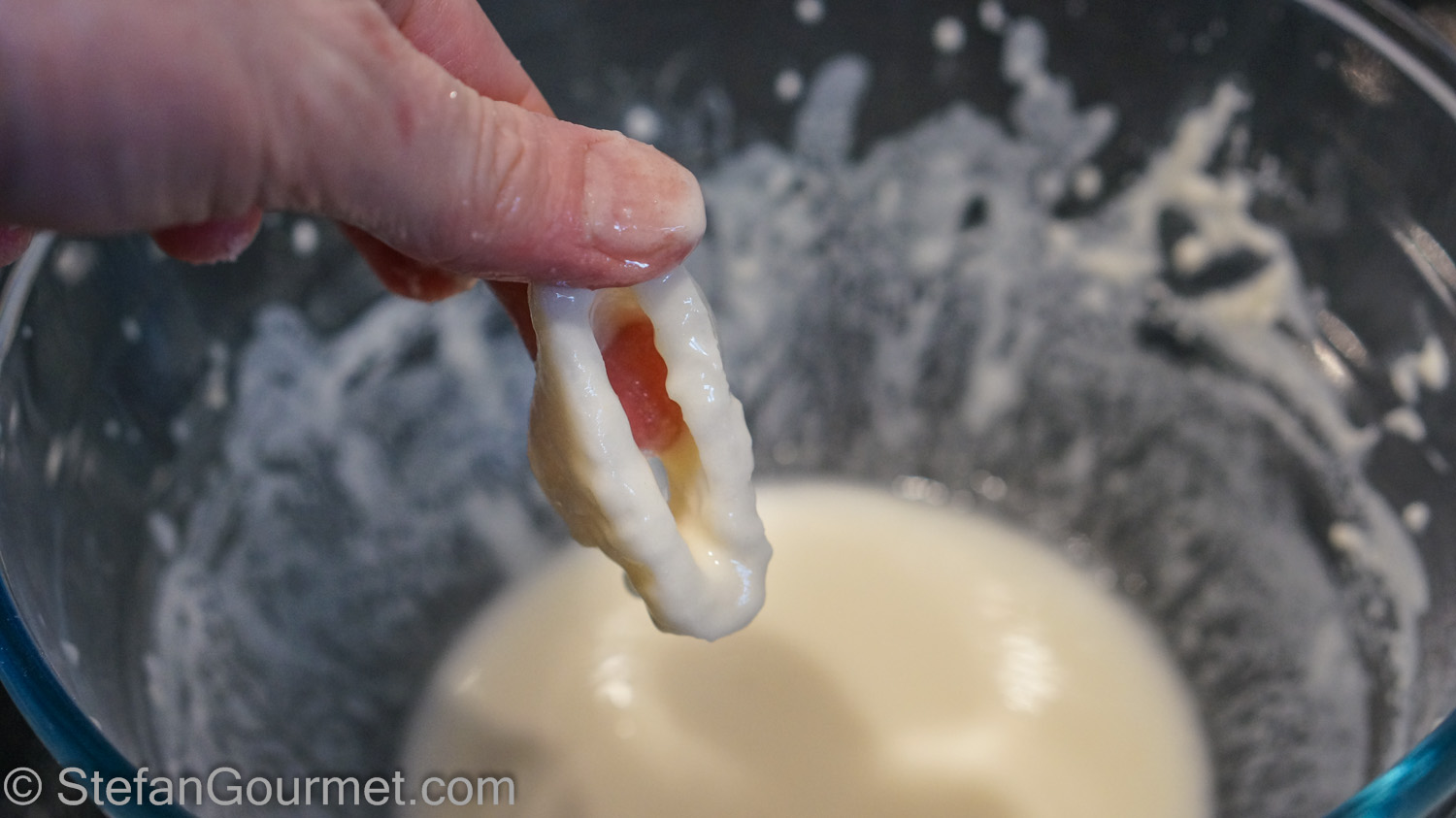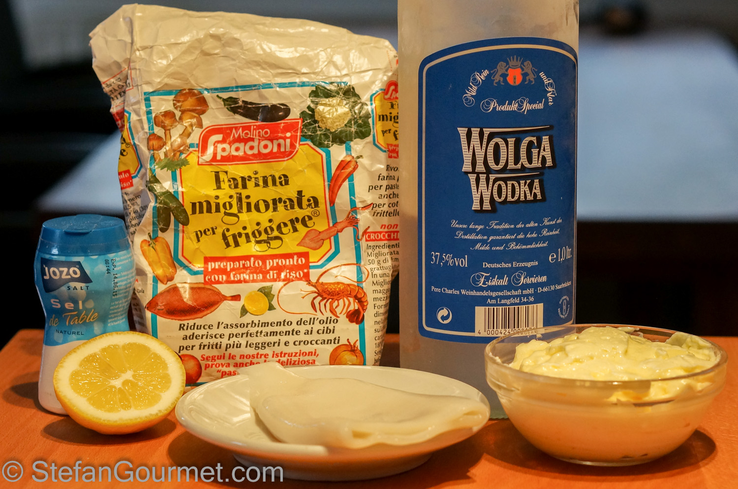 I’ve used a few tricks to improve the traditional recipe. First of all, I use vodka instead of water in the batter to make the calamari more crispy. The alcohol in the vodka will evaporate more quickly than water, so there are more bubbles and thus more crispiness. The other trick is to use a mixture of rice flour and regular flour to have a batter with less gluten and thus less tough. I used Italian “Farina migliorata per friggere” (flour improved for frying), which is a mixture of wheat flour and rice flour, but you could also make your own mixture. It also contains baking soda for more bubbles.