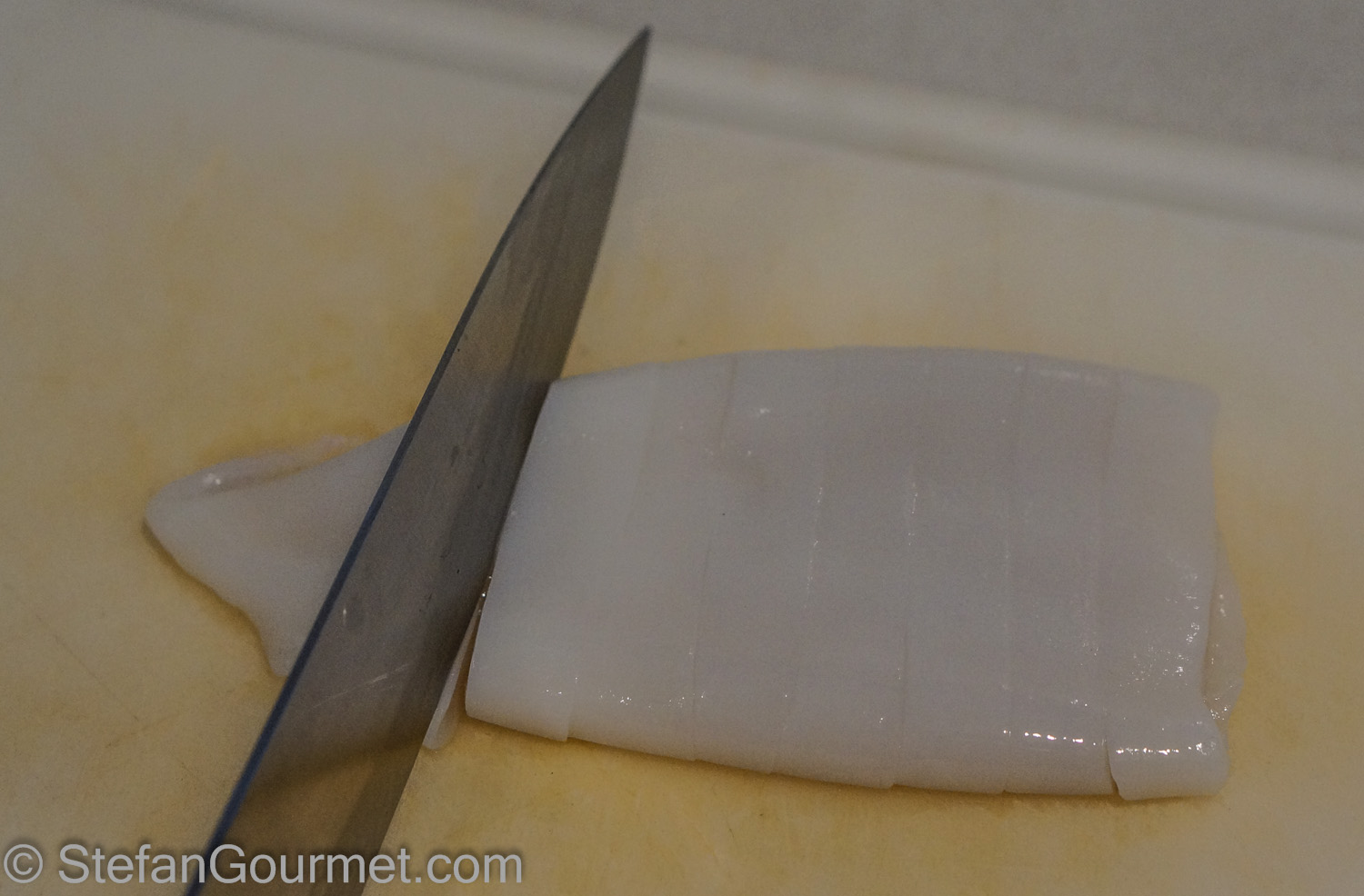 Cut the squid into rings of about 1 cm (1/3 to 1/2 inch).