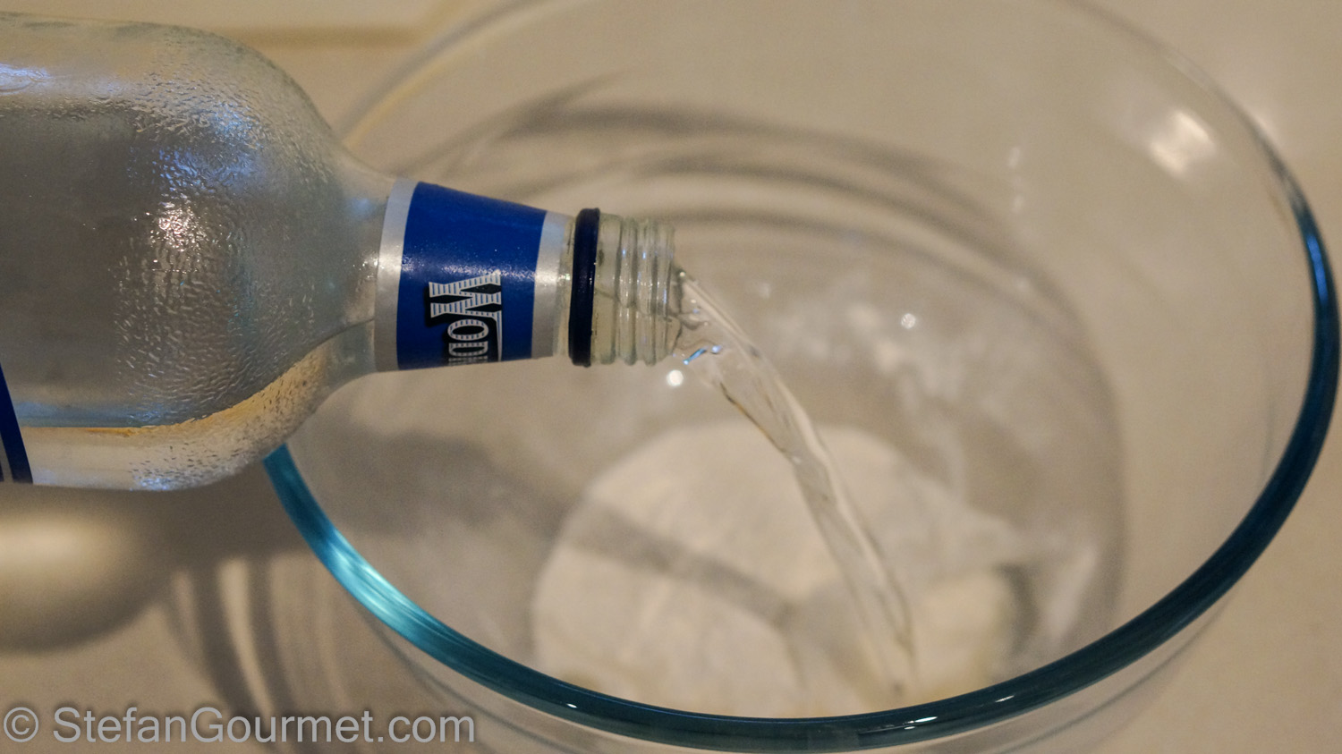 Put the farina migliorata per friggere (or a mixture of flour, rice flour, and baking powder) in a bowl. Add a bit of salt and a bit of the vodka.
