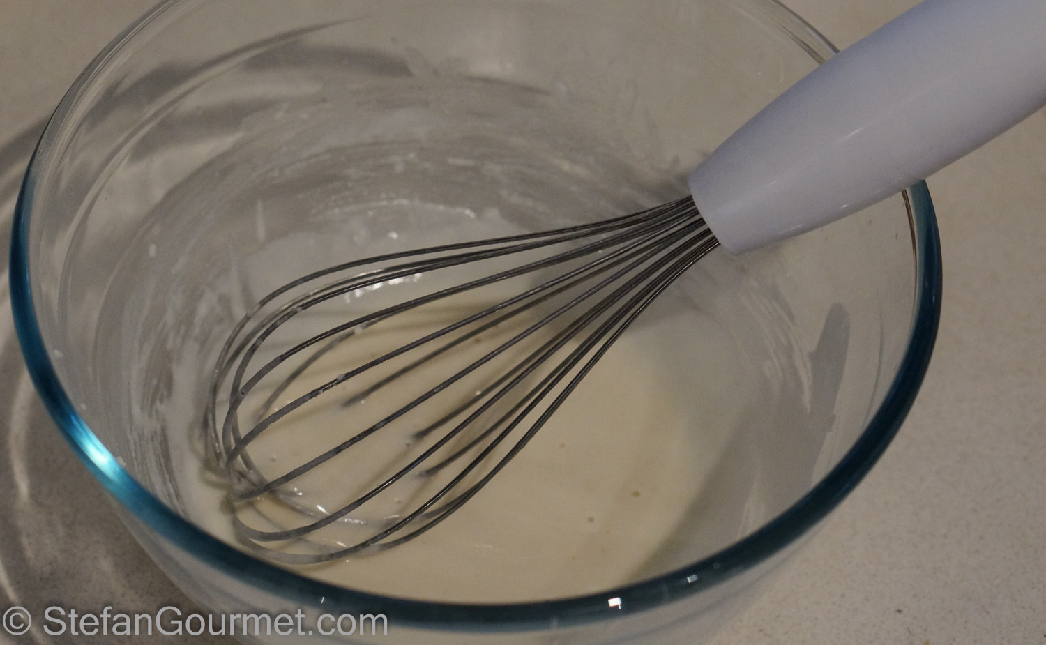 Whisk to incorporate the vodka. Keep adding more vodka and keep whisking until you have obtain a batter that is about as thick as buttermilk. Adding the vodka slowly will help to avoid lumps. Use the batter straight away for best results.