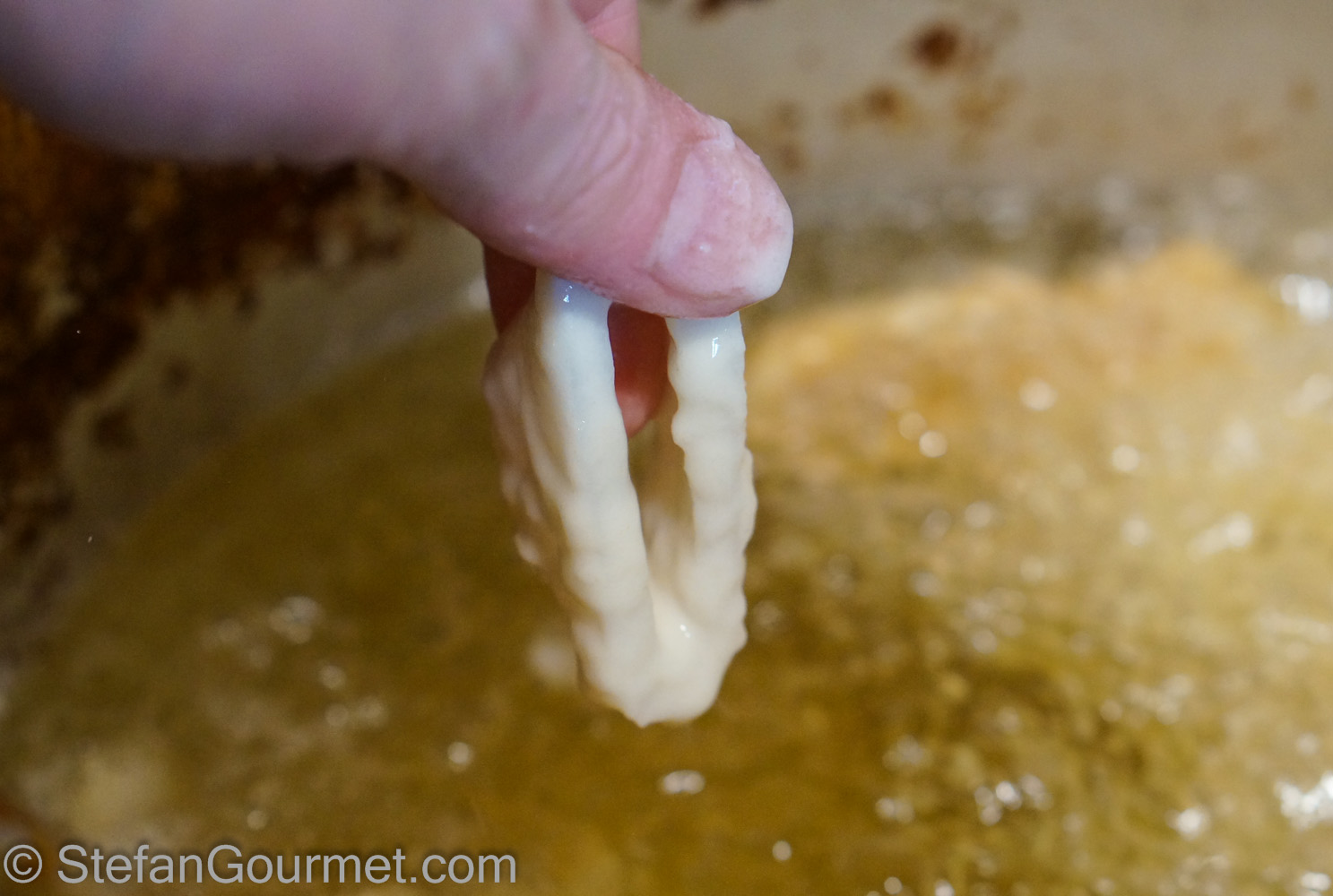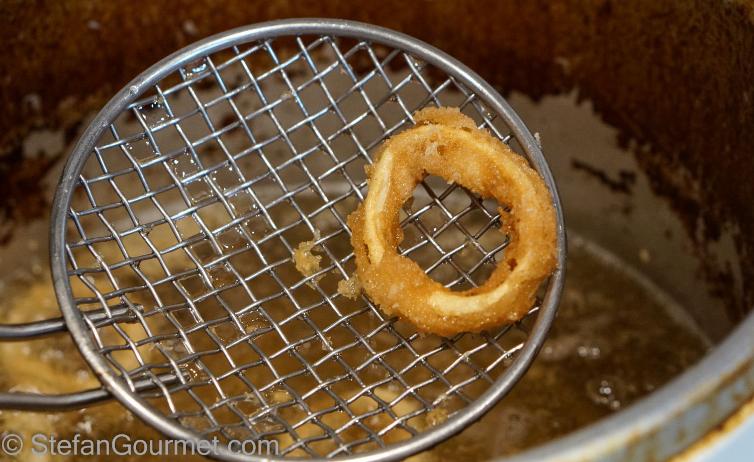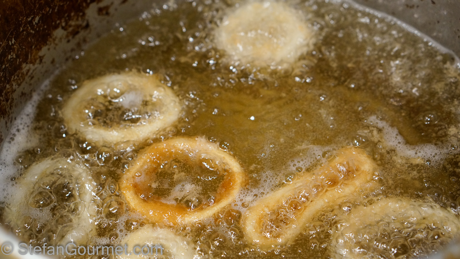 As soon as a ring is golden, take it out of the oil with a skimmer.