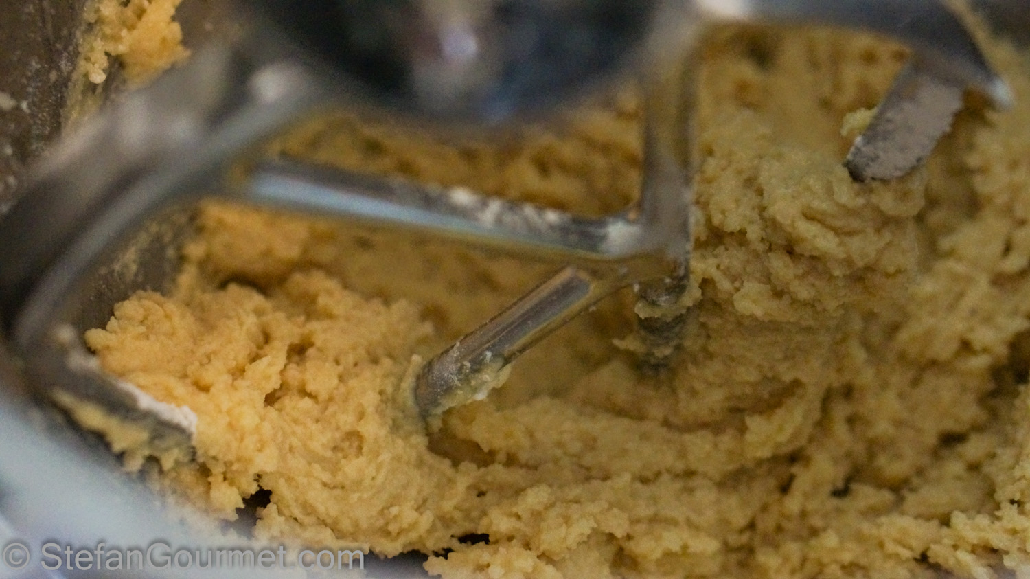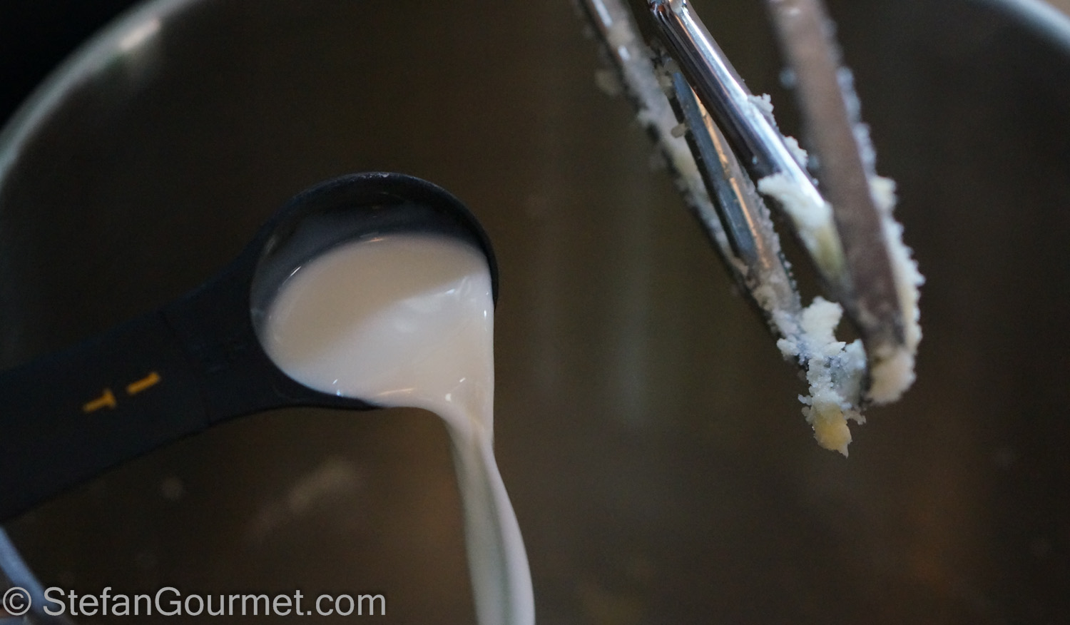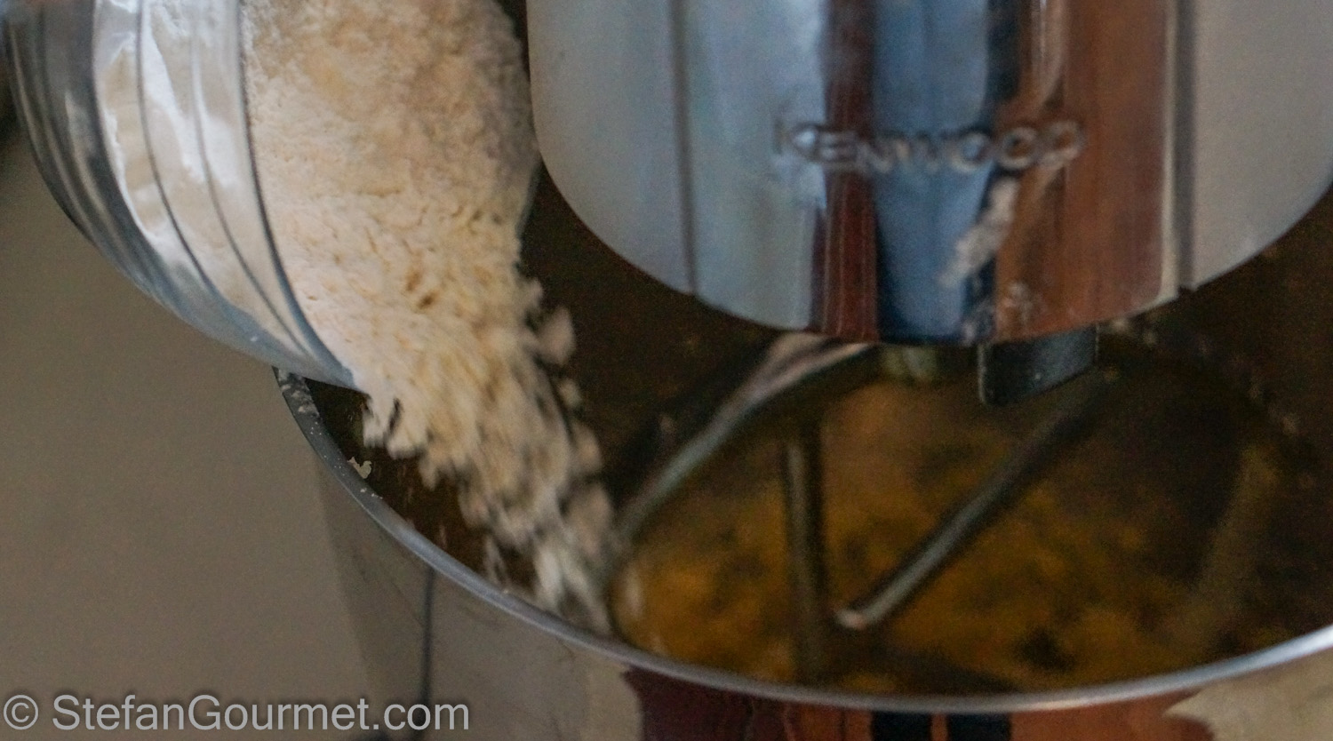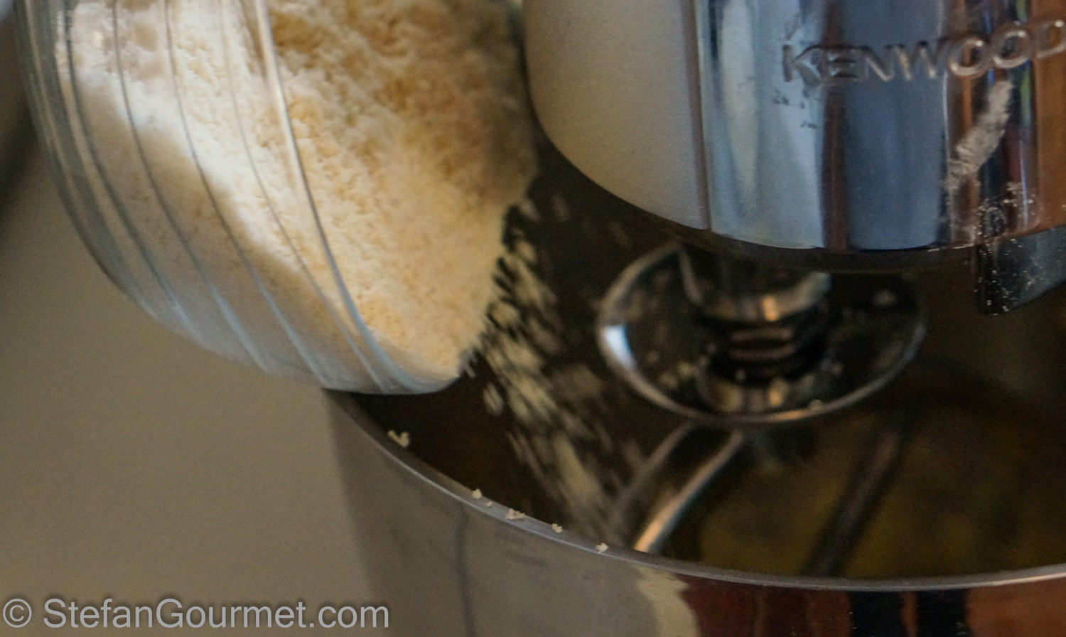 Turn on the mixer and slowly add the almond meal while the machine is running.