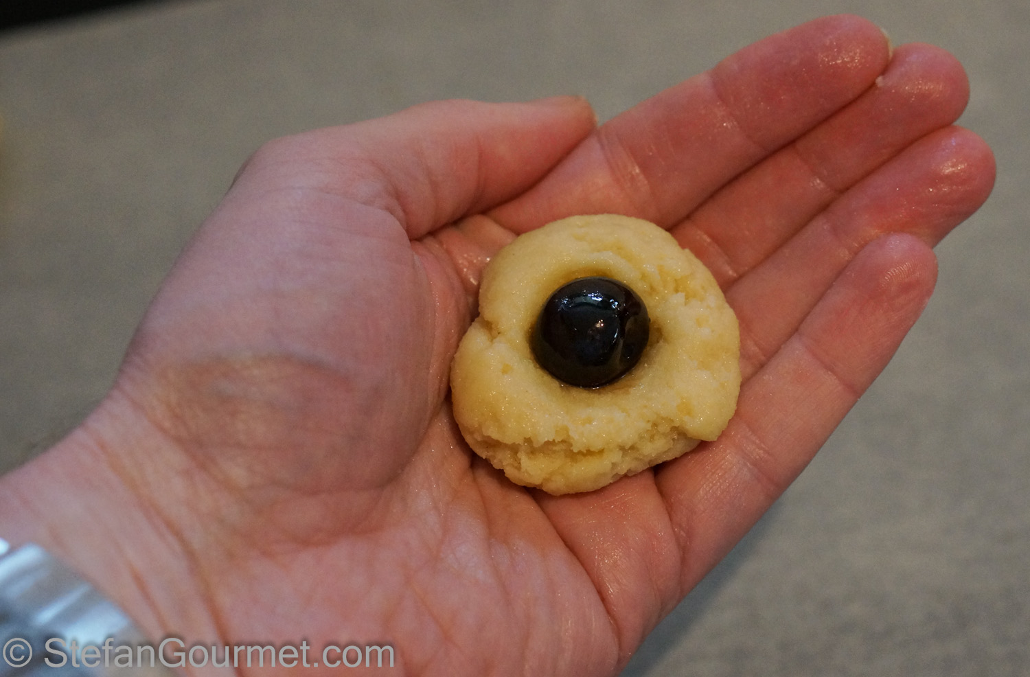 Preheat the oven to 190ºC/375ºF (fan forced). Take 1/16th part of the dough (about a tablespoon) and roll it into a ball using your hands. Flatten the ball of dough a bit and push a cherry into it.