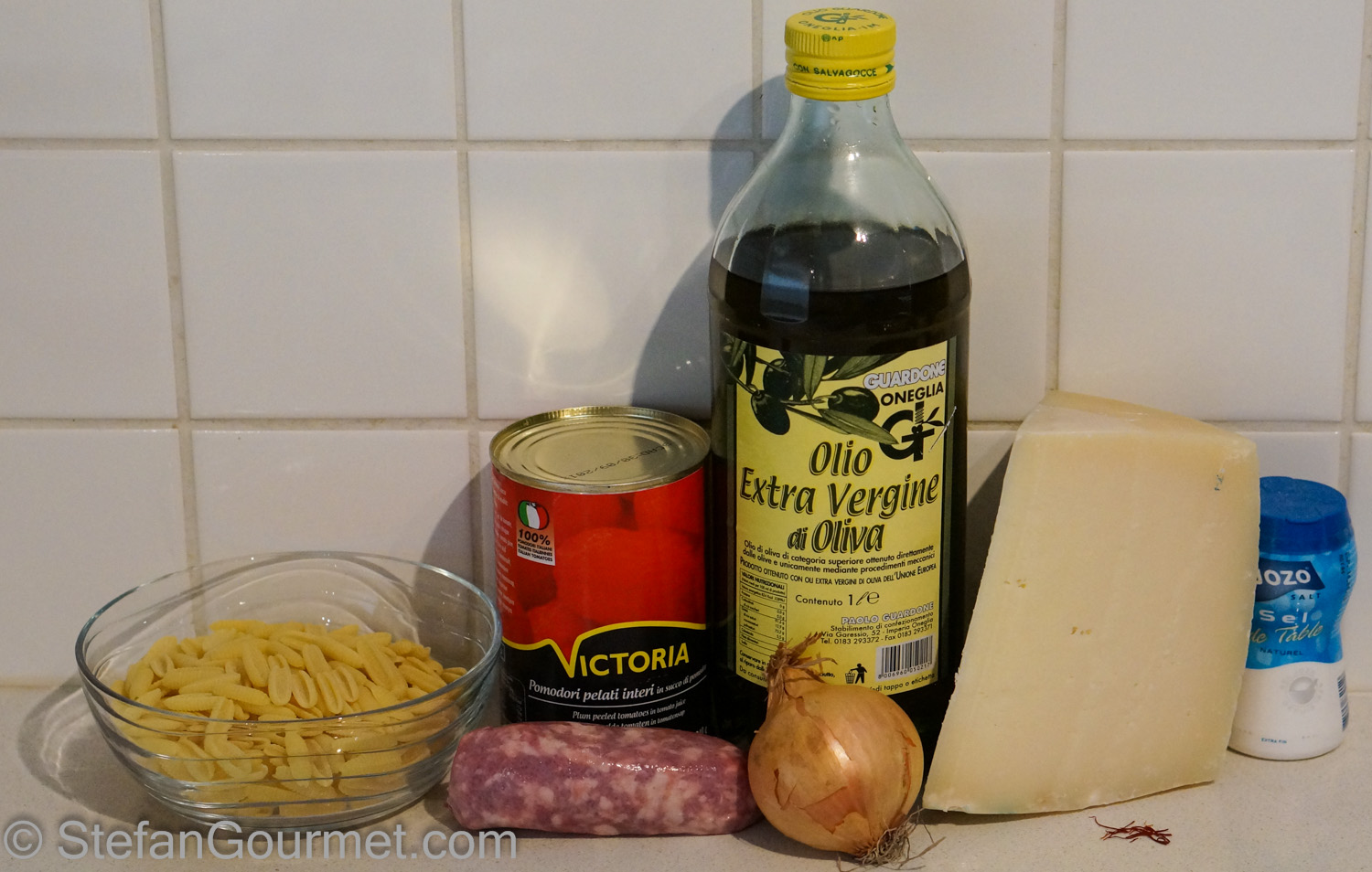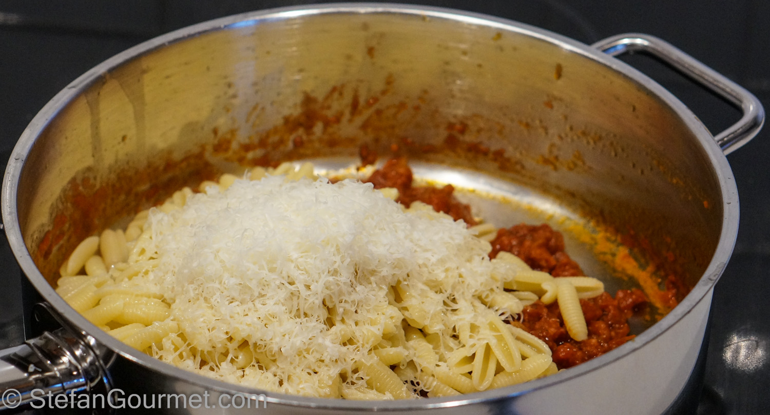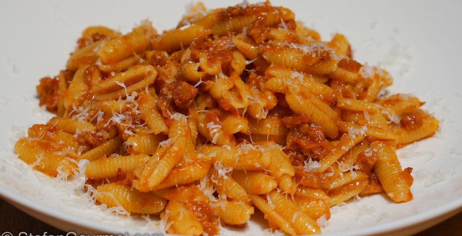 Each region in Italy has its own pasta shapes and pasta recipes. For the southern part of the island of Sardinia the shape is called malloreddus or gnocchetti sardi, and the traditional dish using them is called Malloreddus alla Campidanese. A while ago I showed you how to make fresh malloreddus from scratch, with an amazingly delicious sauce of fennel and sausage. This time I used store-bought dry malloreddus and prepared them traditionally alla Campidanese. This means with (Sardinian) pork sausage, tomatoes, onions, and saffron. It goes without saying that the cheese to be sprinkled over this should be pecorino sardo (sheep’s cheese from Sardinia), which happens to be one of my favorite cheeses.