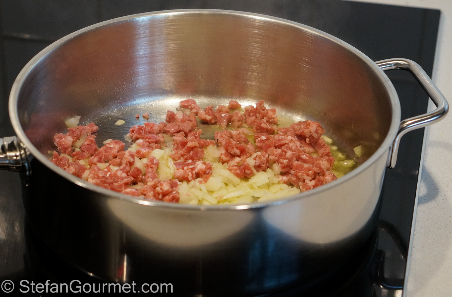 Heat the oil in a frying pan. Add the onion and the sausage meat.