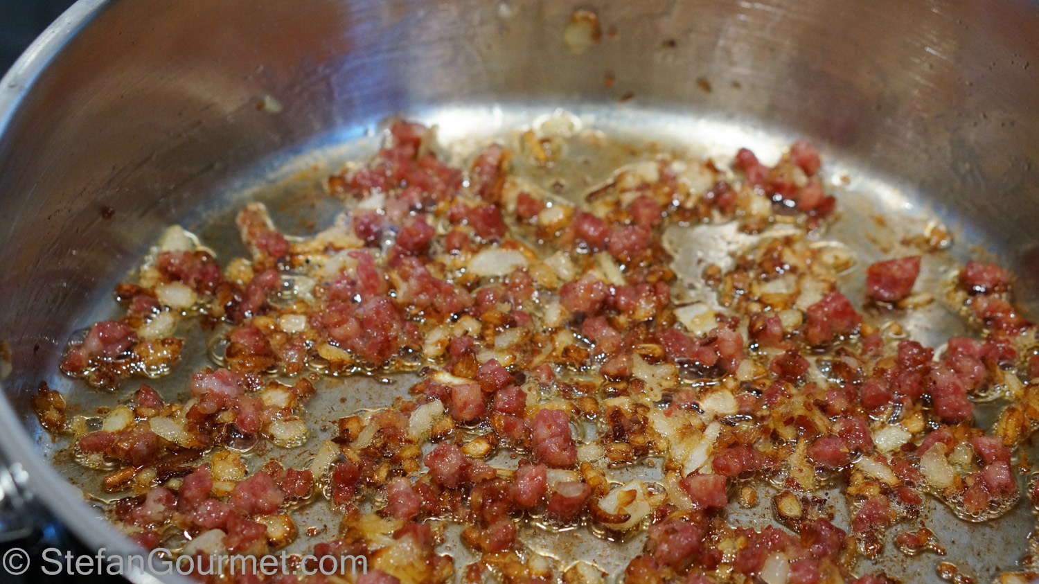 Sauté over medium heat until sausage and onion are golden, about 10 minutes. (I was living on the edge here, as the onions were almost too brown.)