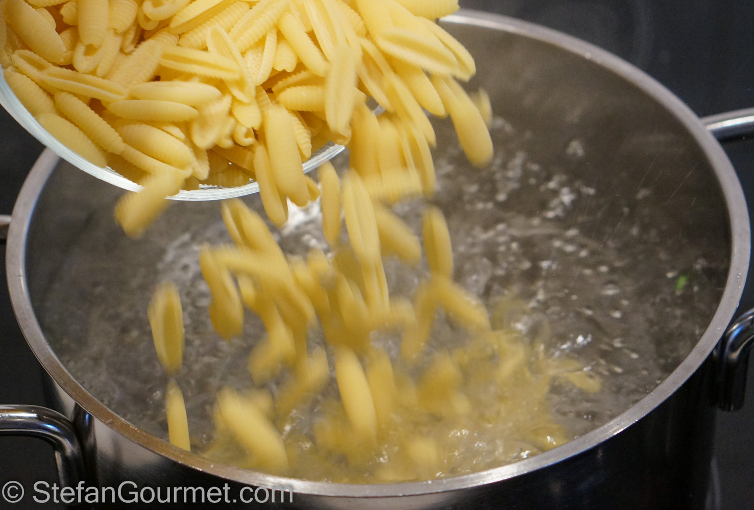 Meanwhile, bring a pot of water to a boil and add salt and malloreddus. Cook the malloreddus al dente according to package instructions.