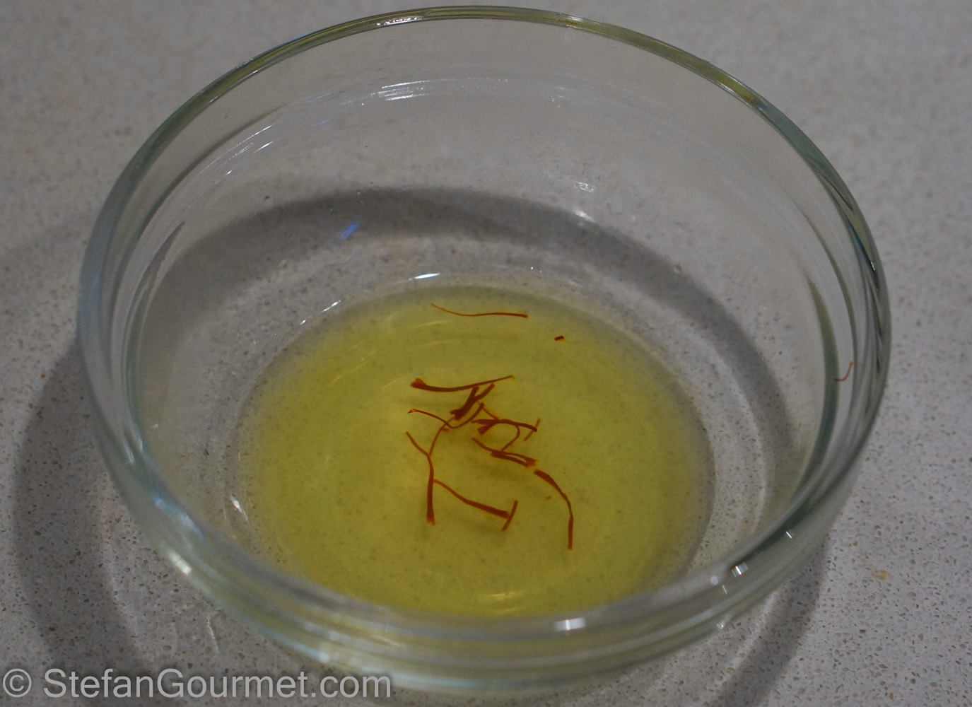 Take about 60 ml (1/4 cup) of the pasta cooking water a few minutes before the pasta is cooked, and add the saffron. Stir and allow to steep for a minute or so.