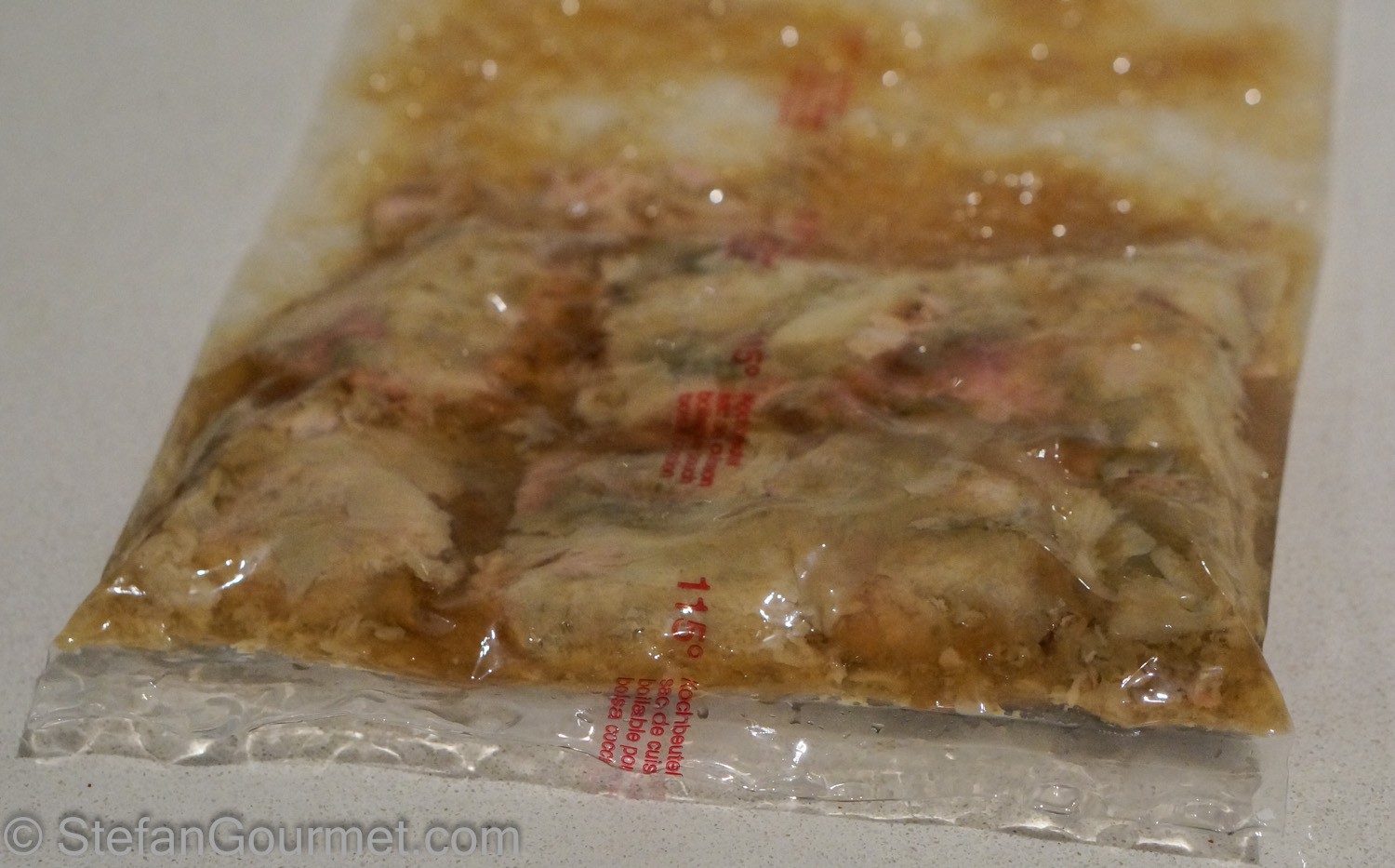 Vacuum seal the pork with the stock. If you don’t have a chamber vacuum sealer, freeze the pork stock into cubes first. Due to the long cooking time using a ziploc bag is advised against, as doing so can produce off-flavors.