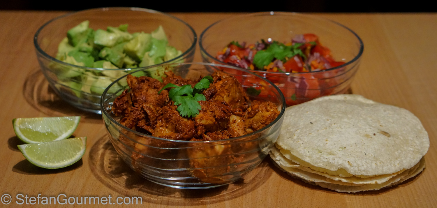 After my trip to REMCooks I was inspired to try some more Mexican/Southwestern food. Carnitas is a dish made of braised or roasted and then fried or sauteed pork in Mexican cuisine. Richard had served us delicious sous-vide duck carnitas, and a few days later in Miami I tried a taco with pork carnitas. The recipe I used here is very simple and comes from Modernist Cuisine at Home, the home version of the Modernist Cuisine books that I wrote about before. Pork shoulder is cooked sous-vide for 36 hours at 65ºC/149ºF together with pork stock, and then glazed with the juices seasoned with achiote paste and chipotle chile powder. I served it with homemade corn tortillas, pico de gallo salsa, and avocado.