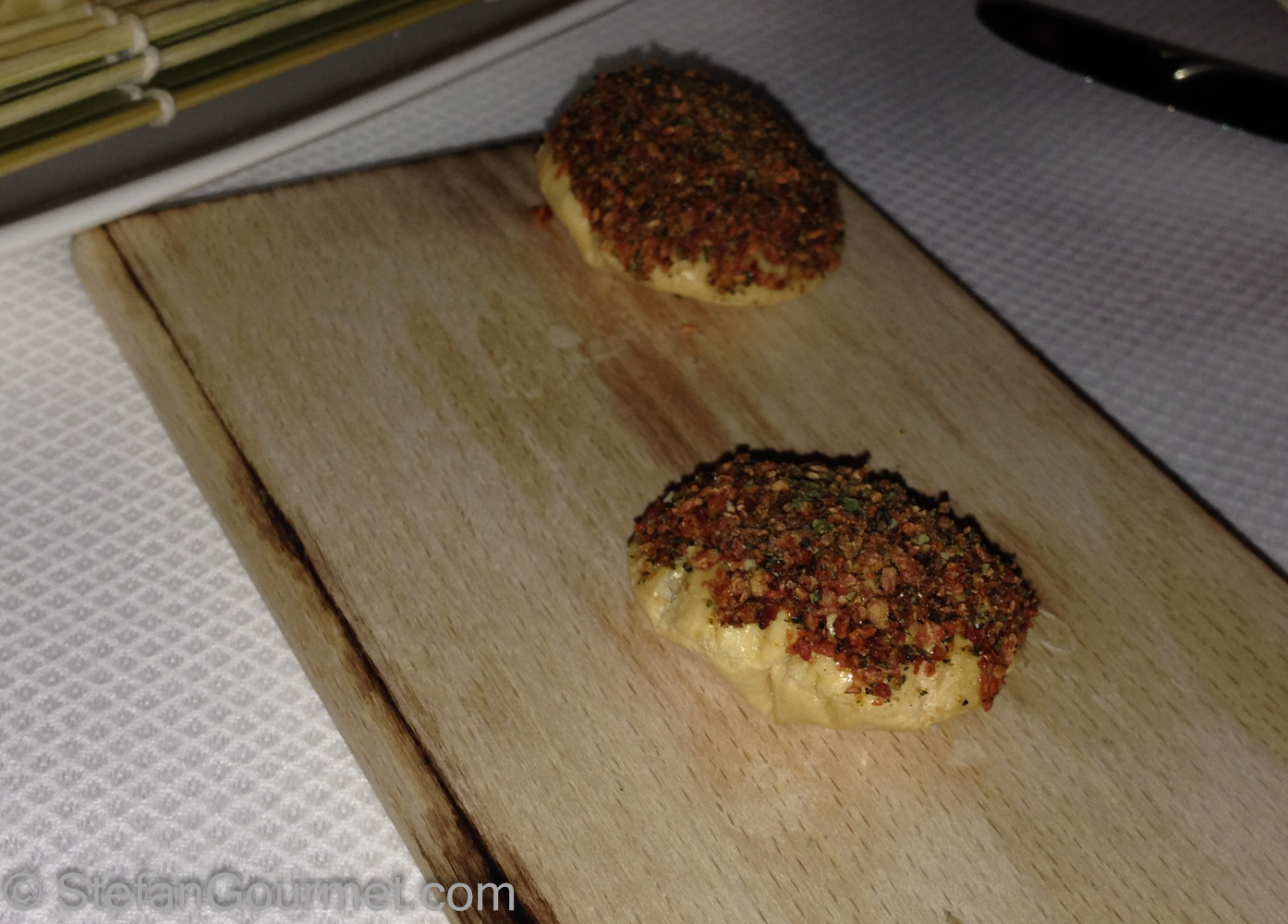 There was also a very thin ham & onion cracker (like shrimp crackers, but thinner) with cream of parmigiano in a tube. All in all a very nice set of amuse-bouches, 8/10.