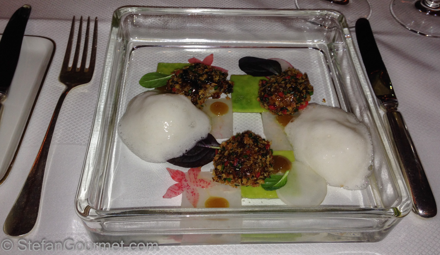 The first course: langoustine, marinated and crispy, avocado, ginger and lemongrass. The foam was made of kombucha ‘tea’, also combined with langoustines during our dinner at Librije last year. I really liked the crispy langoustine fritters, with tender juicy langoustine inside and caramelized langoustine used for the crispy outside. It was adequately paired with a grüner veltliner from Kamptal (Austria). (I believe a wine with just a touch of residual sugar would have worked even better (as the crispy langoustine had a sweet note), but most restaurants don’t dare to serve an off-dry wine.) 8/10