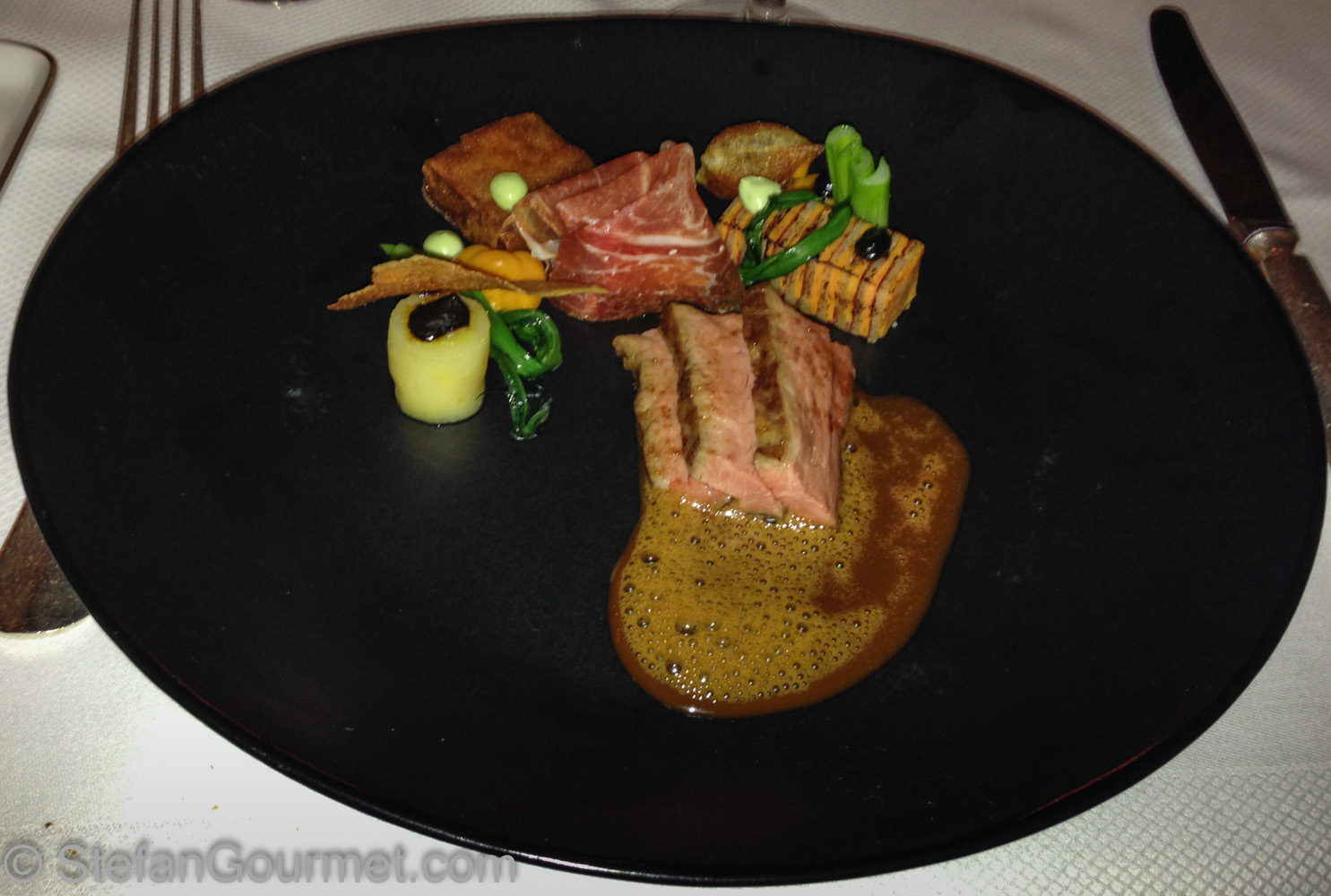 Iberico pork: jamón iberico (pata negra), grilled shoulder piece, and braised cheek (in a crunchy package), triple sherry jus, sweet potato, and black garlic. A very nice main course with perfectly cooked meat. I especially liked the layered ‘bar’ with jamón and sweet potato. Such a Spanish dish asks for a Spanish wine, and you can’t get more Spanish than tempranillo. The pairing was good, although not as good as the previous course. 8/10