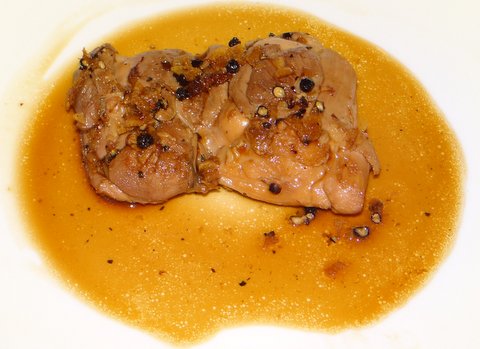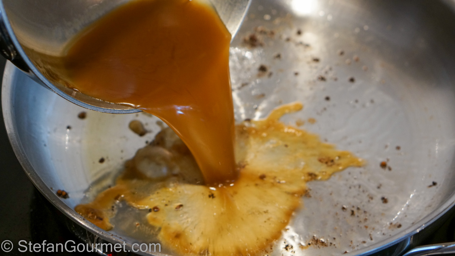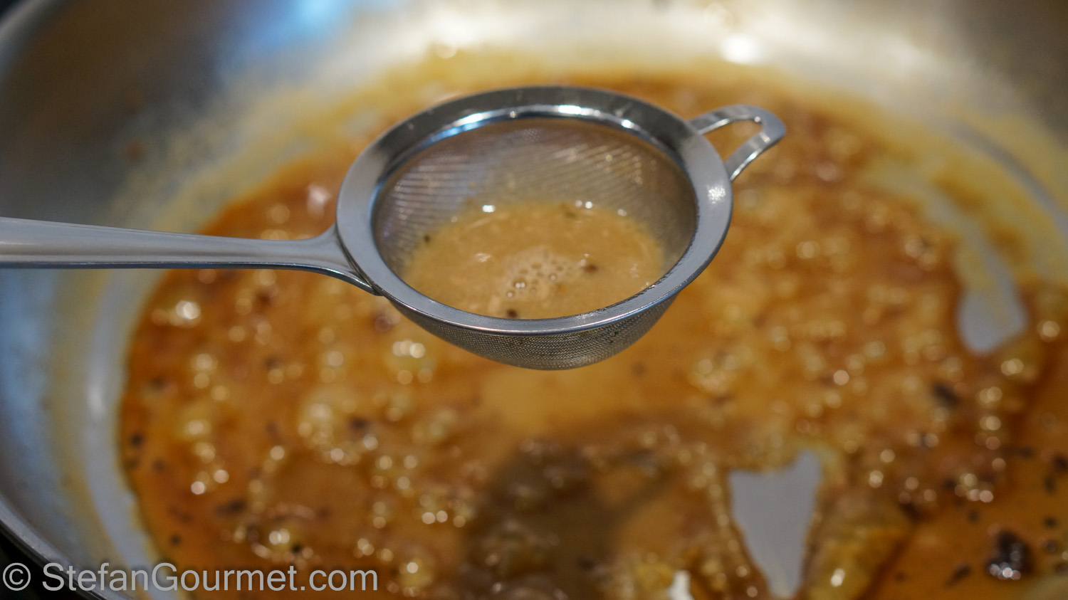 [Because the meat was cooked at only 57ºC/135ºF, you cannot add the juices to the sauce without ending up with ‘scum’ in the sauce. Bringing it to a boil and sieving helps to avoid this problem.]