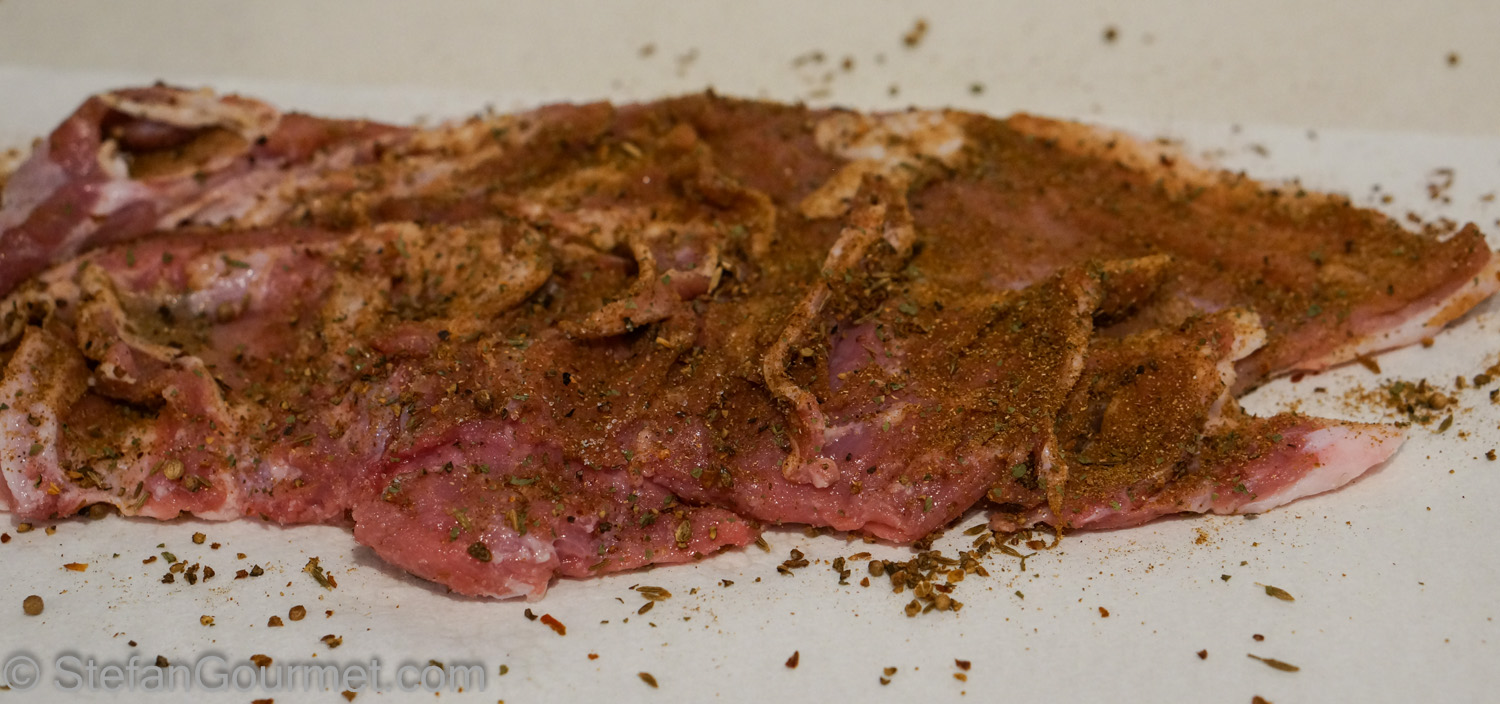 On Sunday I rubbed the breast of lamb with garam masala on both sides. I used about 2 Tbsp for about 450 grams (1 lb) of lamb, which was probably slightly too generous. I also seasoned it with salt.