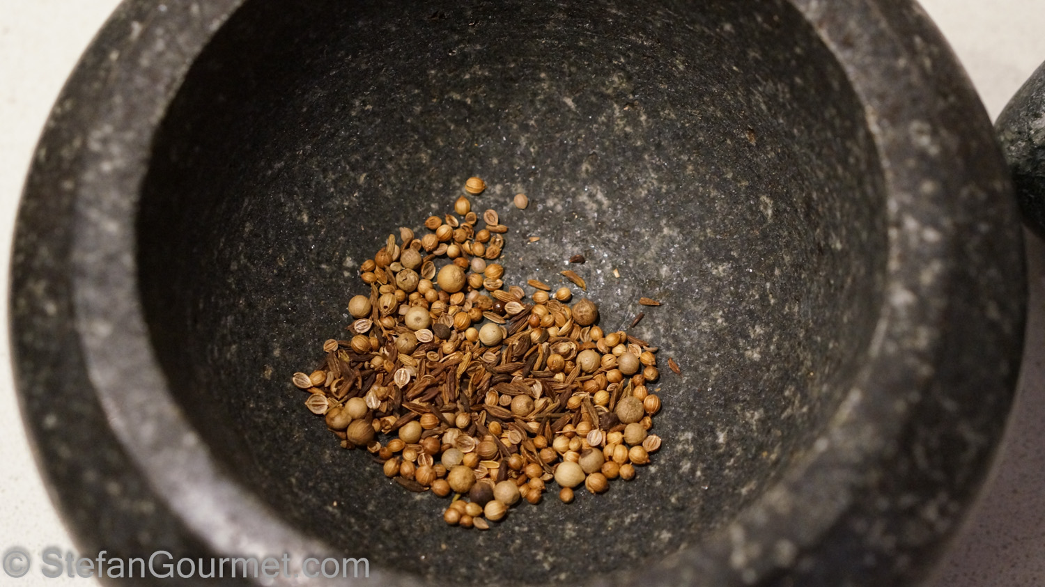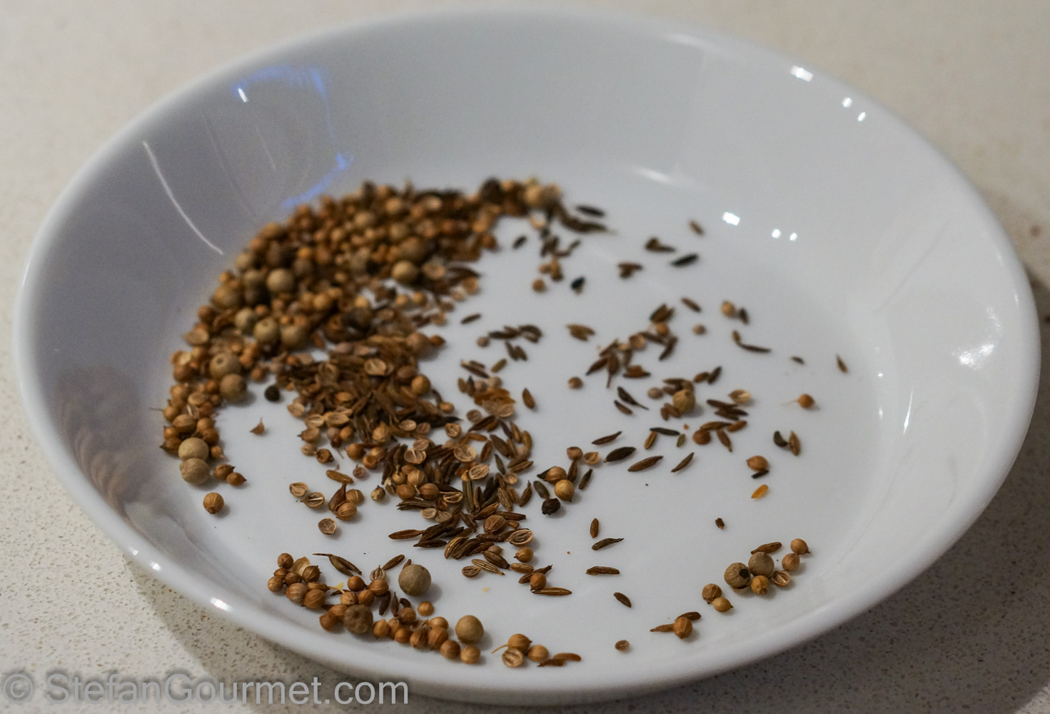 Roast the white pepper, cumin, and coriander for 5 minutes at 180ºC/350ºF.
