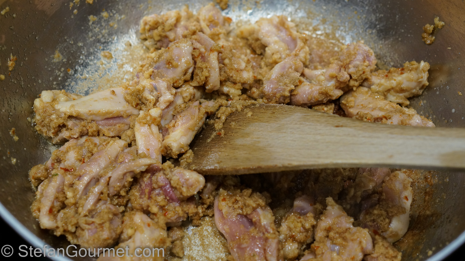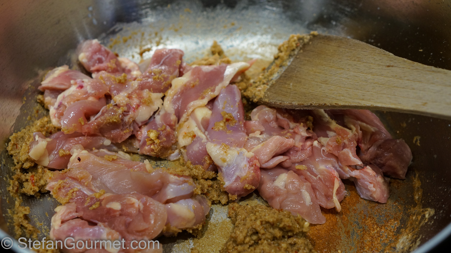 Stir the chicken for a minute until you see no more pink and it is coated with the curry.
