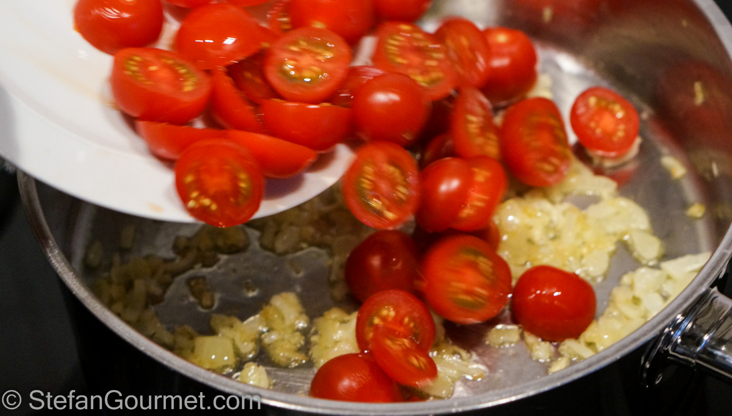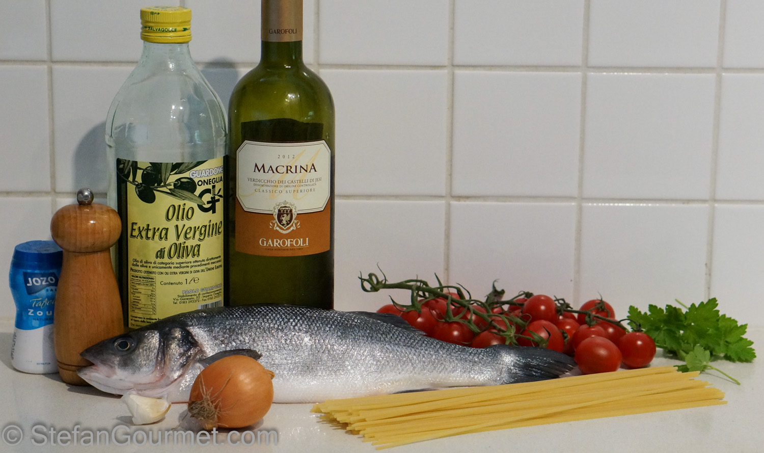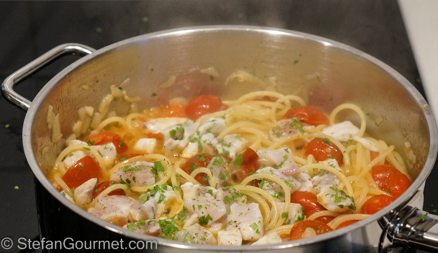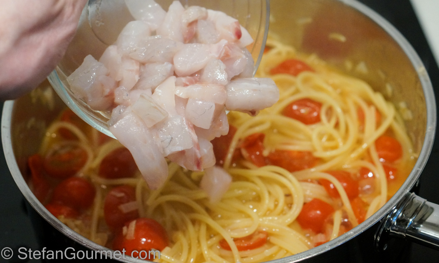 Even though it is a simple dish with simple ingredients, it is important to cook it right. As is often the case, that means not overcooking anything. The garlic and onions should not be overcooked (i.e. they should not be browned). The cherry tomatoes should not be cooked to pulp. The fish should not be cooked until it falls apart. The spaghetti should be kept al dente.