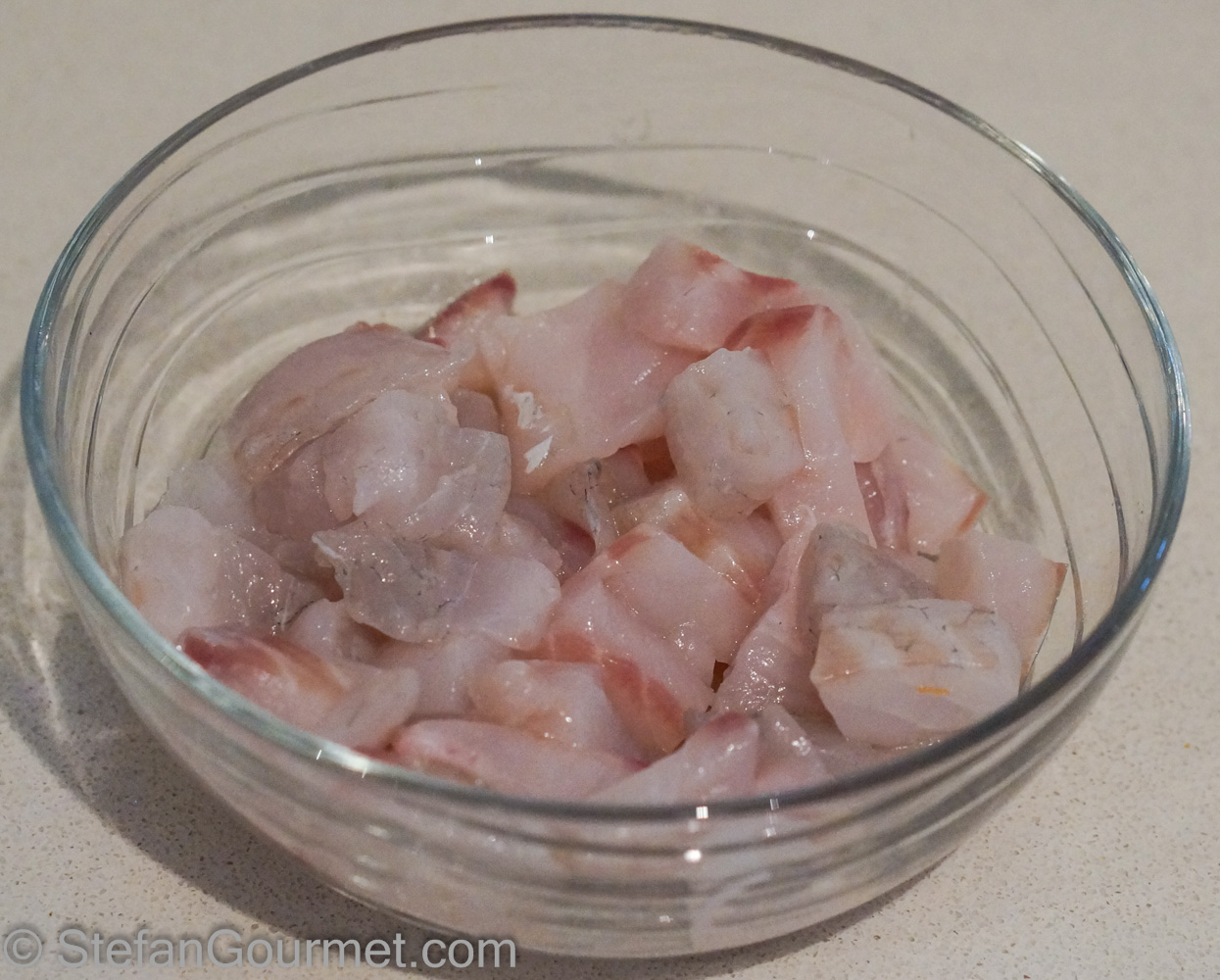 Cut the fish fillets into 1 cm (1/2 inch) pieces. Season with salt and reserve.