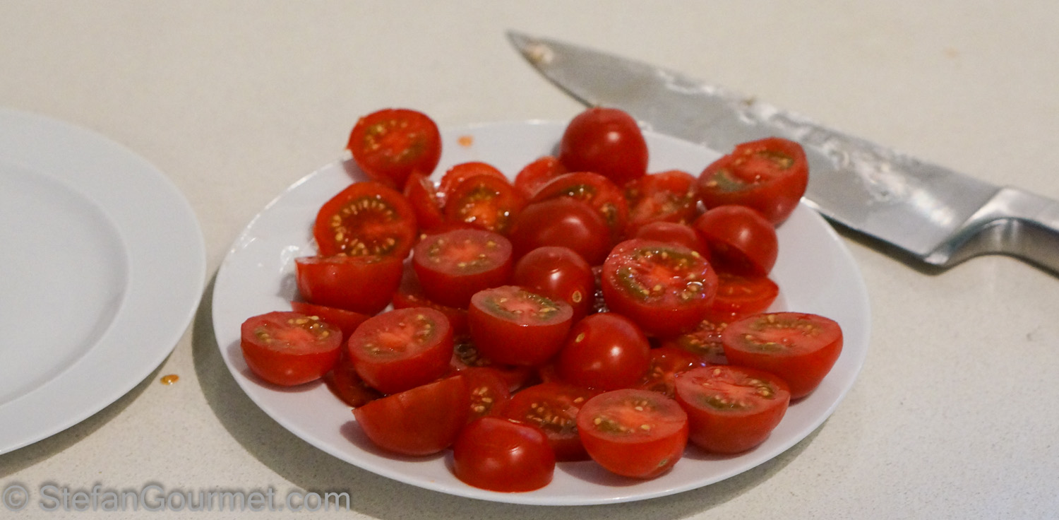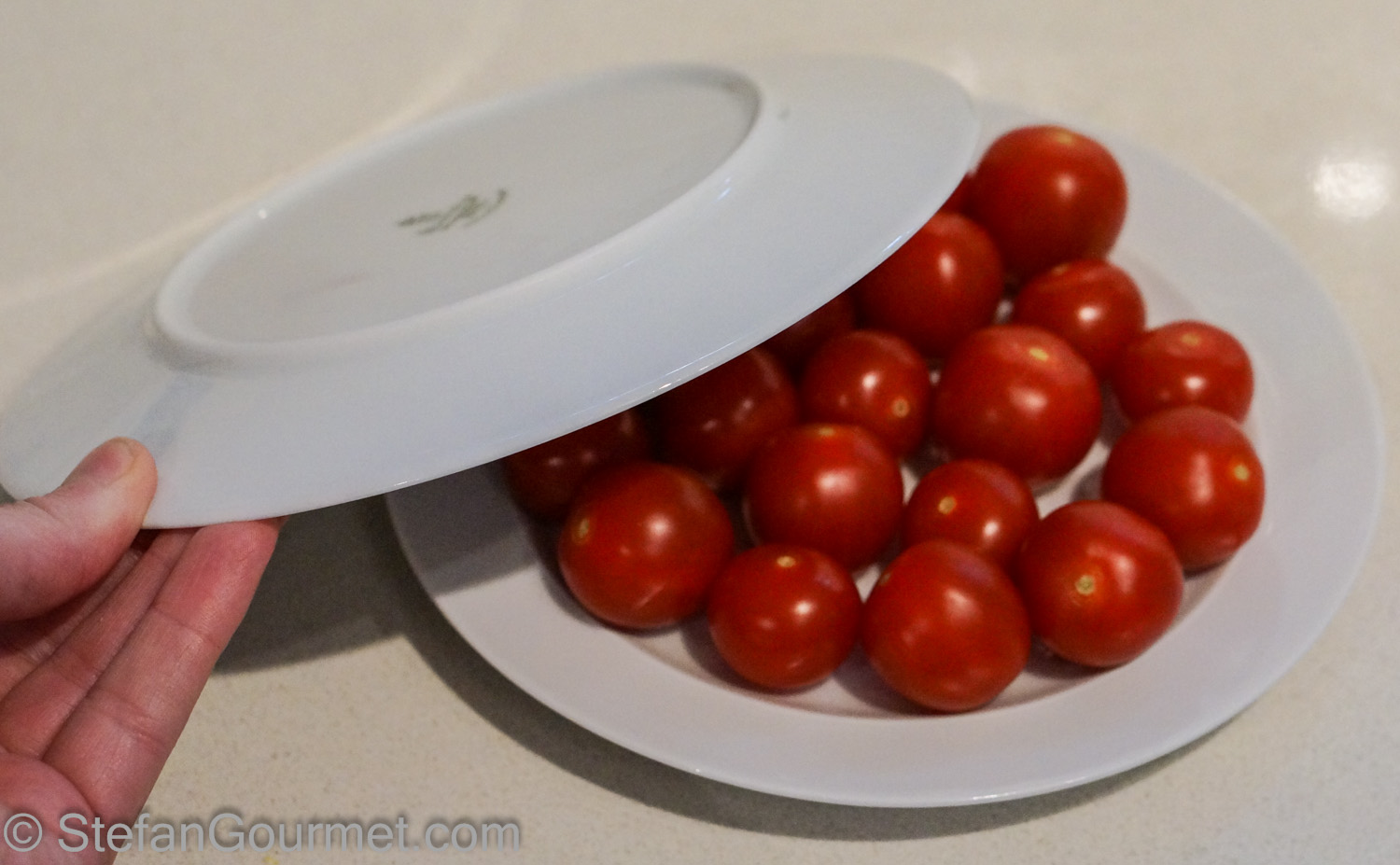 Meanwhile, cut the tomatoes in half. There is a neat trick to do this quickly. Arrange the tomatoes on a plate and cover them with another plate.