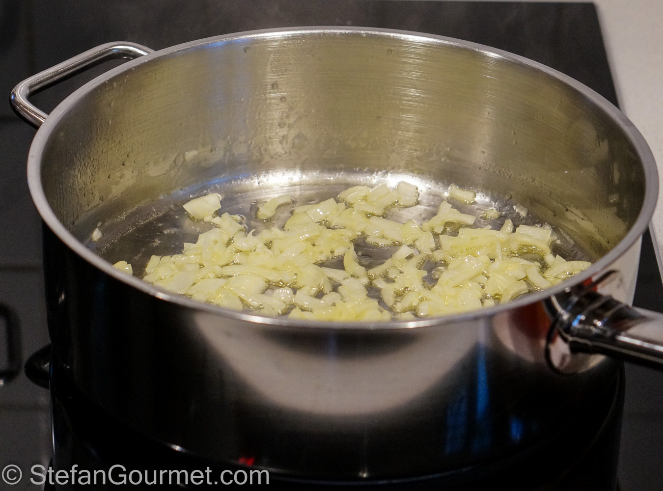 While the spaghetti is cooking, prepare the sauce. Sweat the onion and garlic in the olive oil in a frying pan over medium heat until the onion is soft and fragrant, about 5 minutes.